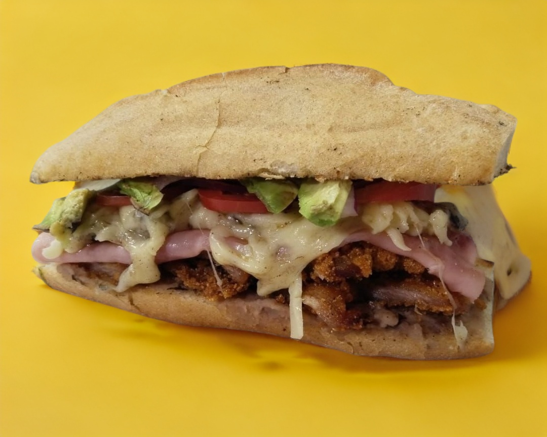 Frijoles refritos, milanesa, jamon, queso oaxaca, jitomate, cebolla morada y aguacate
