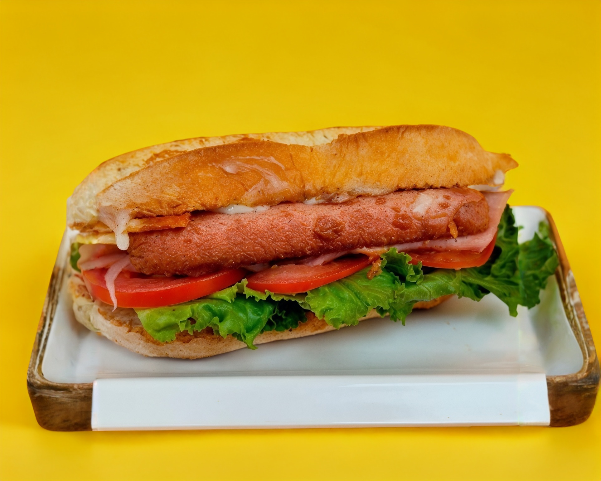 Jamón, salchicha, tocino, costra de queso oaxaca, chipotle acompañado de lechuga, cebolla morada y jitomate.