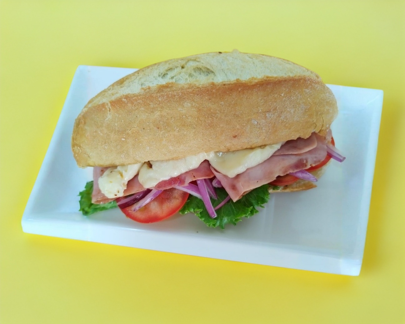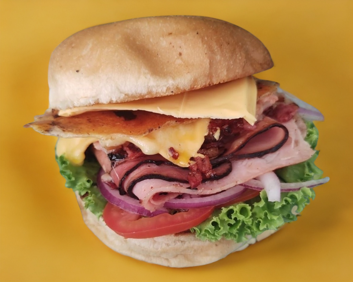 Bollo brioche, jamon, tocino,selva negra, queso amarillo, costra de manchego, lechuga, jitomate, cebolla morada acompañada de papas doradas