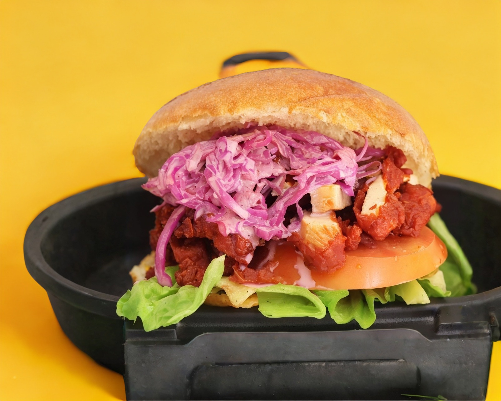 Bollo brioche, pollo frito con bbq, lechuga, jitomate, cebolla morada y ensalada de col acompañada de papas doradas