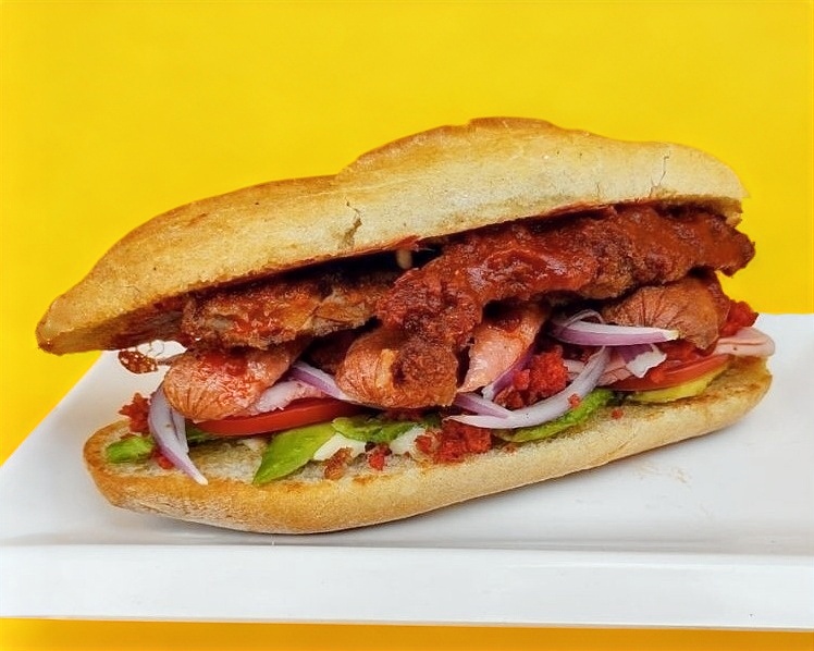 Chorizo, jamón, salchicha,tocino, acompañada de chipotle, lechuga, cebolla morada y jitomate.