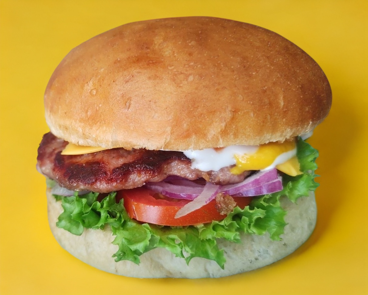 Disco de carne res, lamina queso amarillo, lechuga, jitomate, cebolla morada, catsup,crema,mostaza con guarnición de papas doradas y aderezo chipotle.