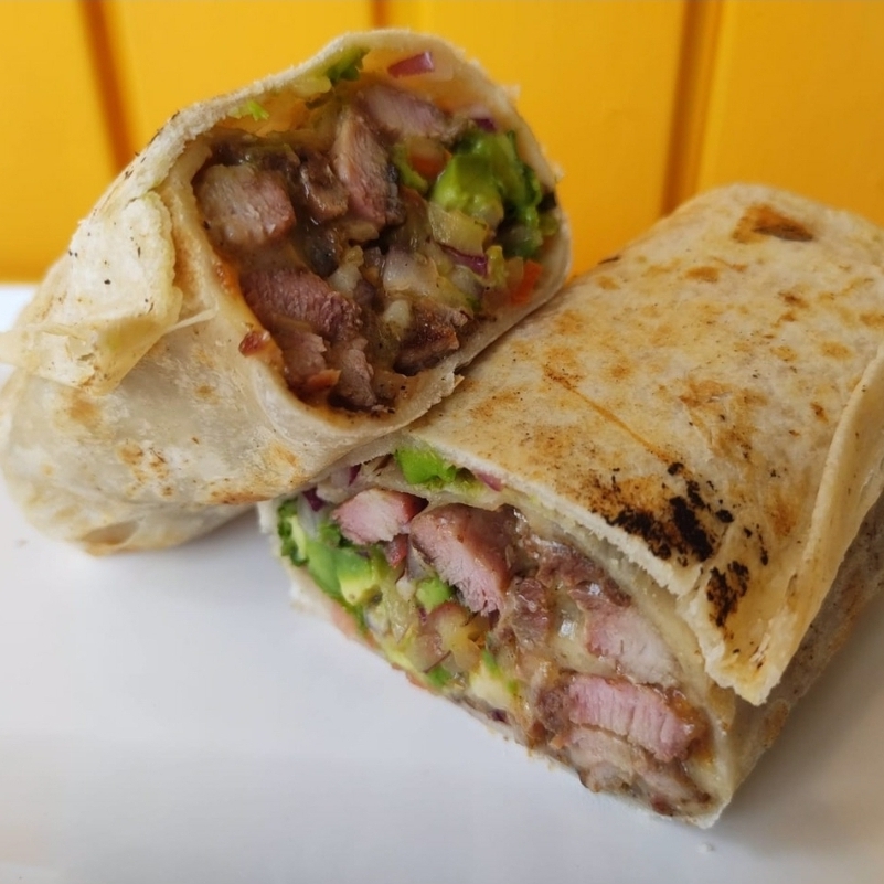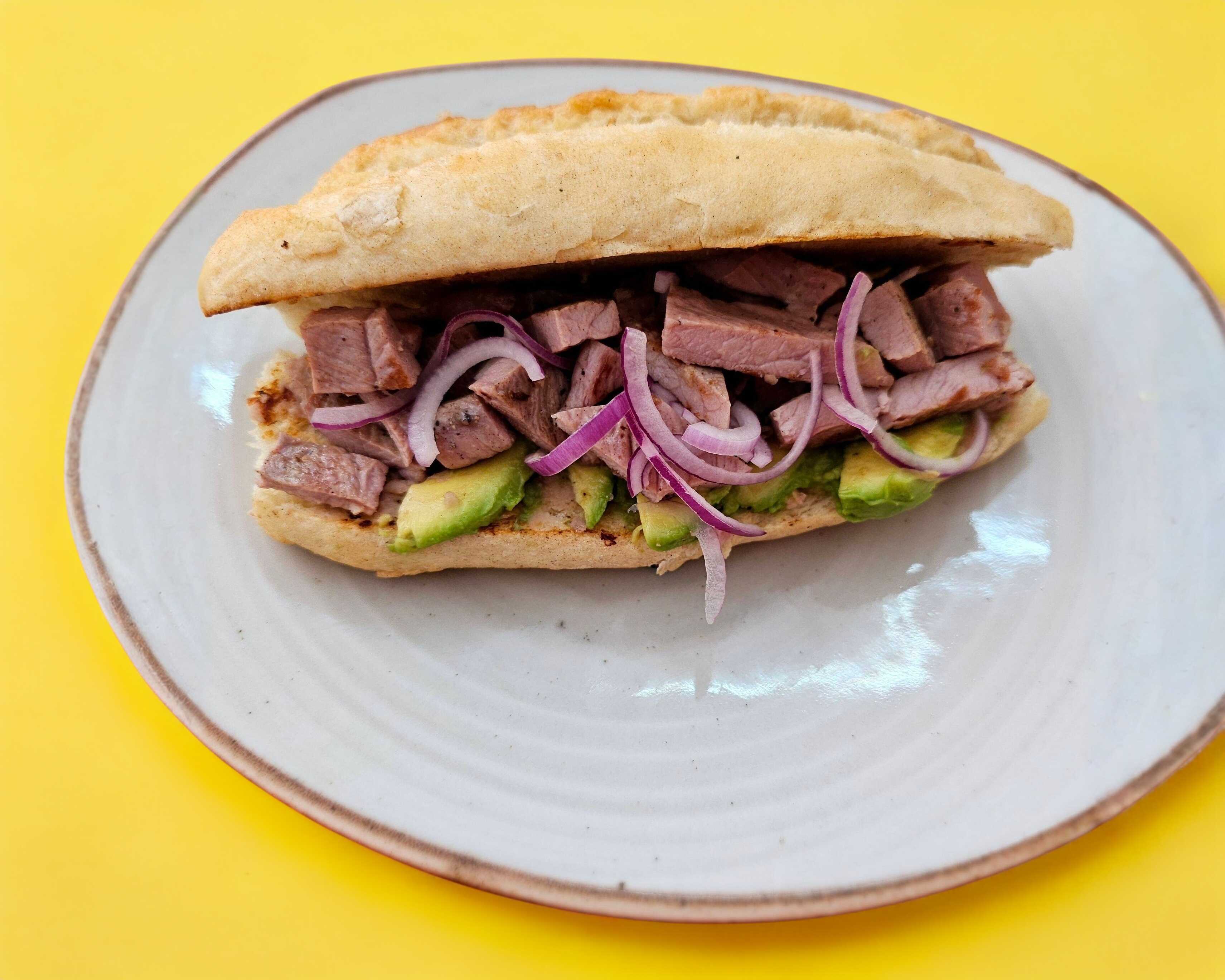 Pan birote, frijoles refritos, aguacate,cebolla morada, carne arrachera a la plancha 100 gramos.