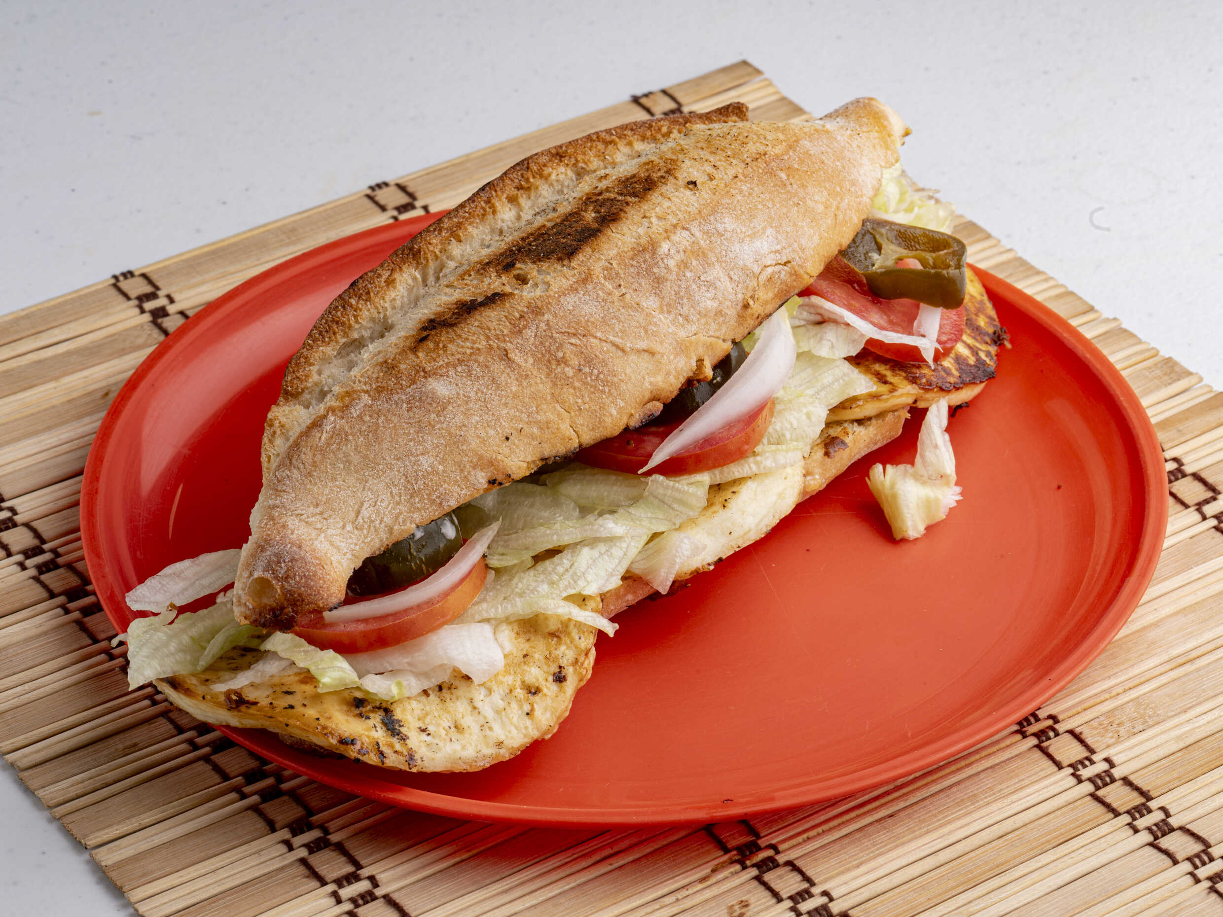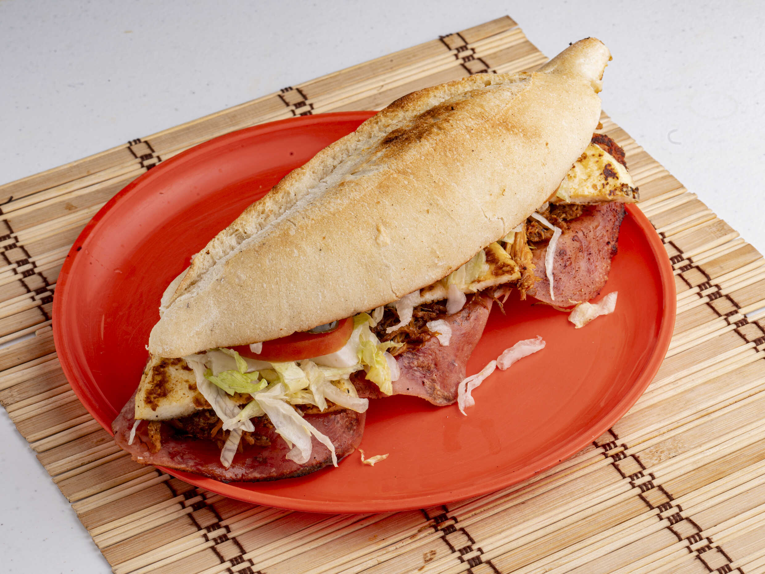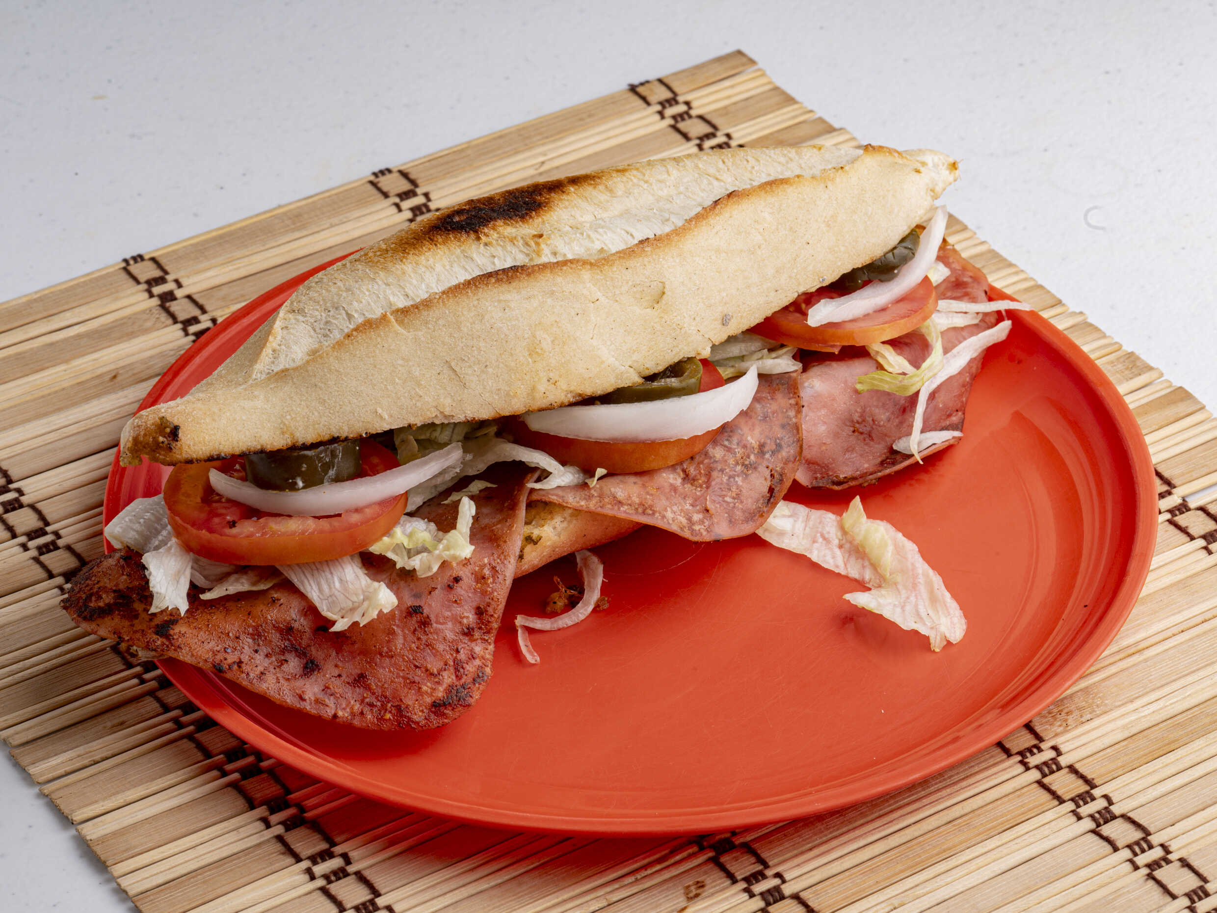 Pan integral, jamón asado, panela asada, lechuga, jitomate, cebolla, chile jalapeño, chilito de la casa, catsup y mostaza