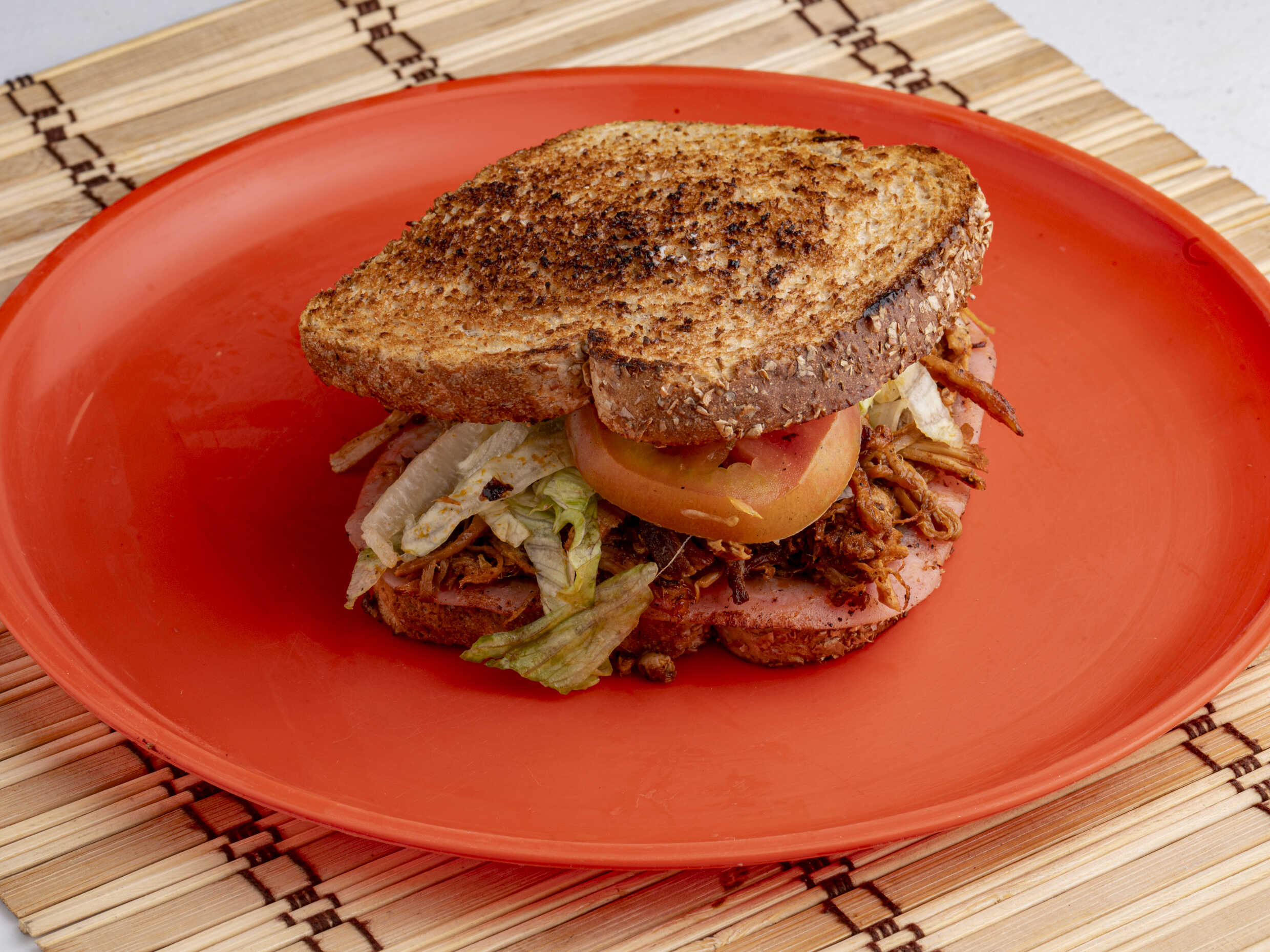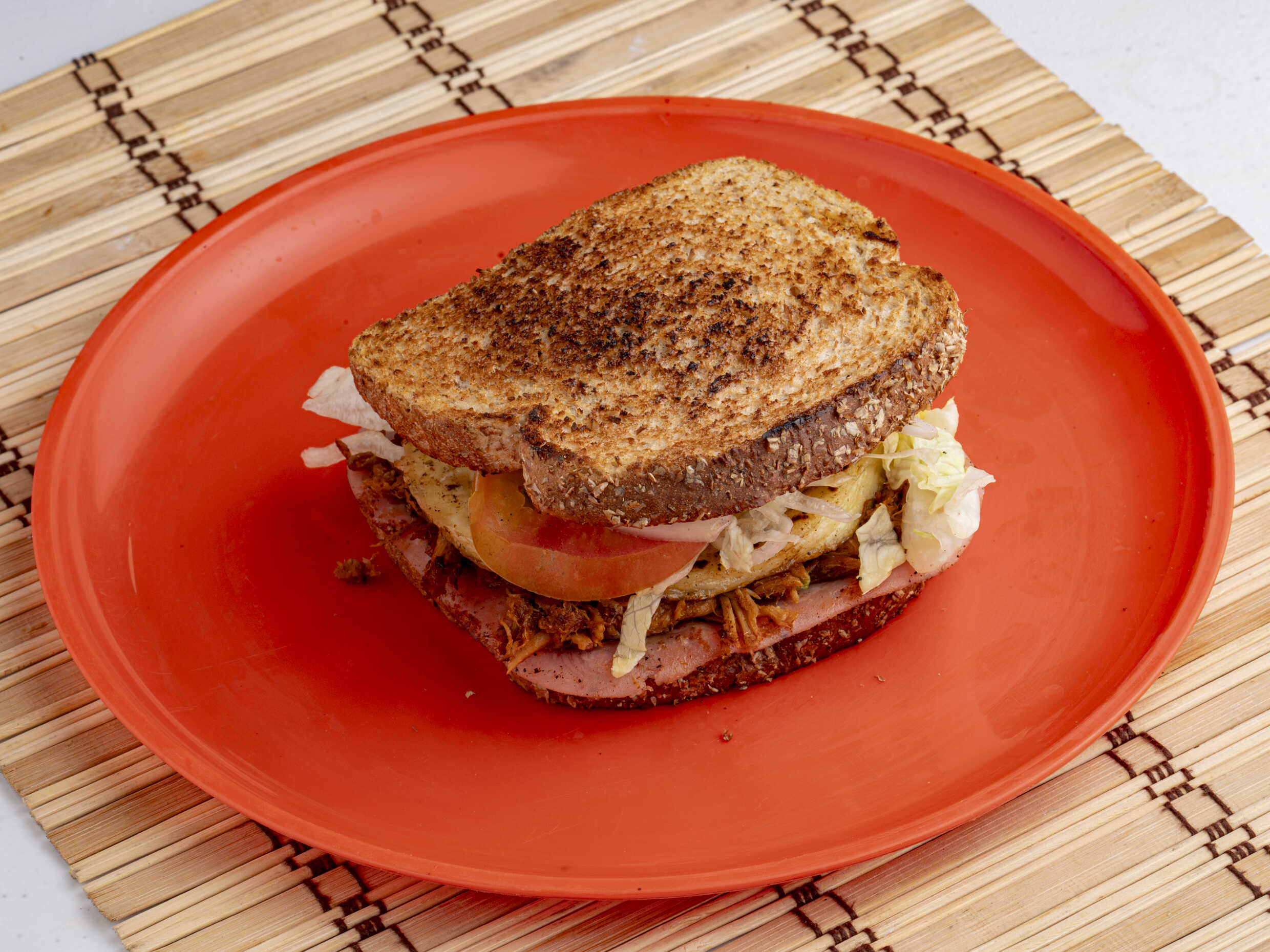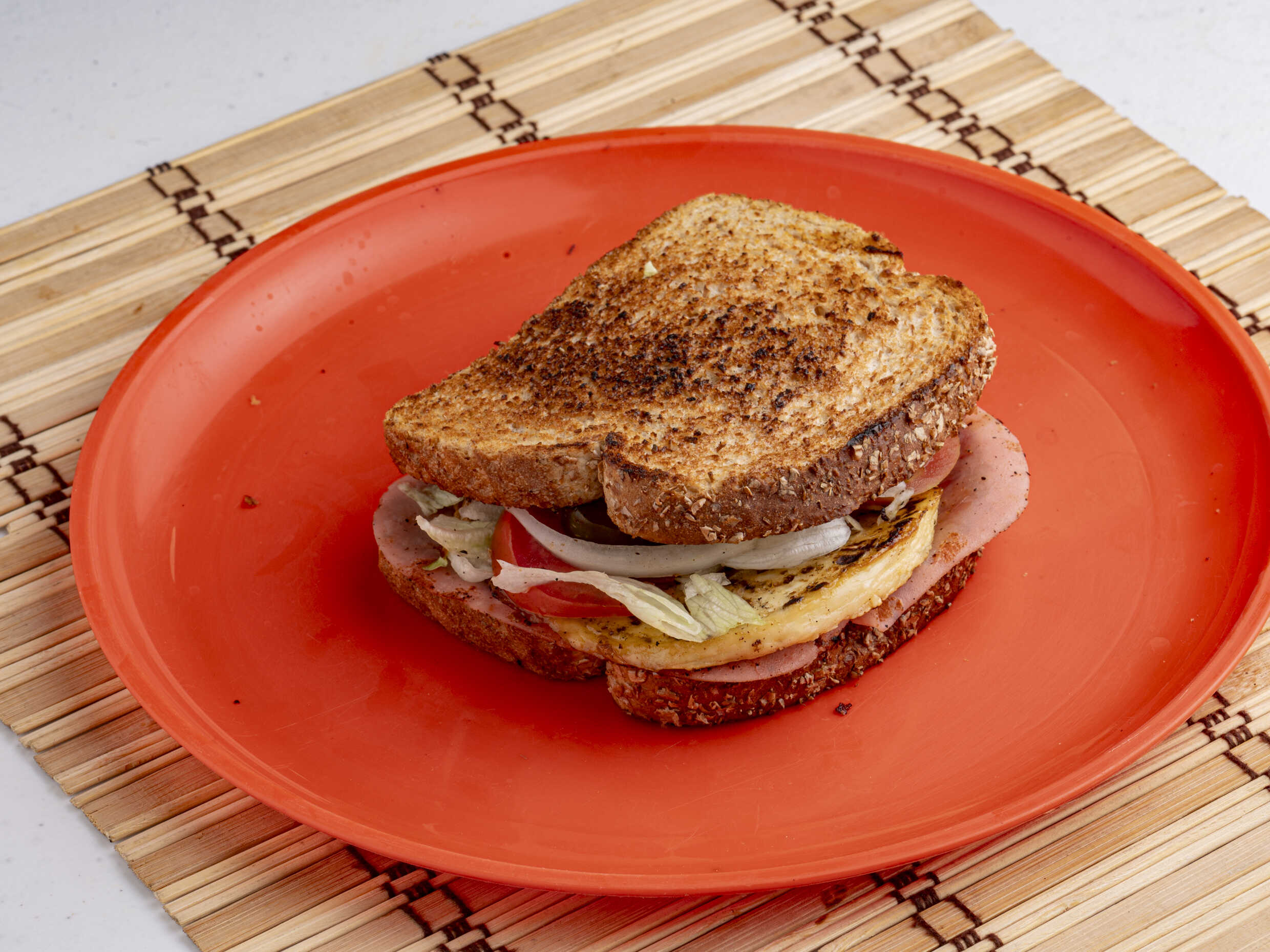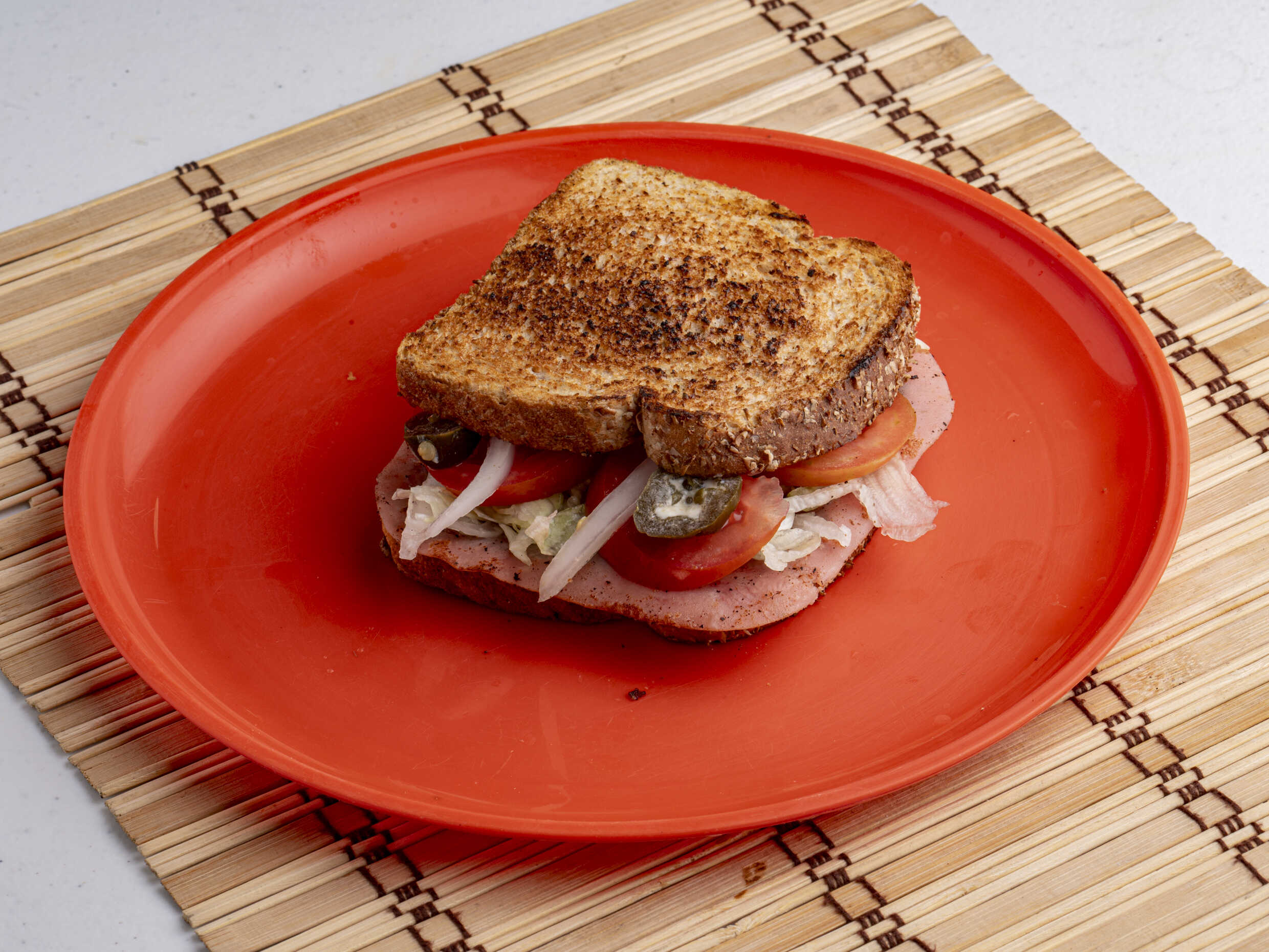 Pan integral, jamón asado, panela asada, lechuga, jitomate, cebolla, chile jalapeño, chilito de la casa, catsup y mostaza