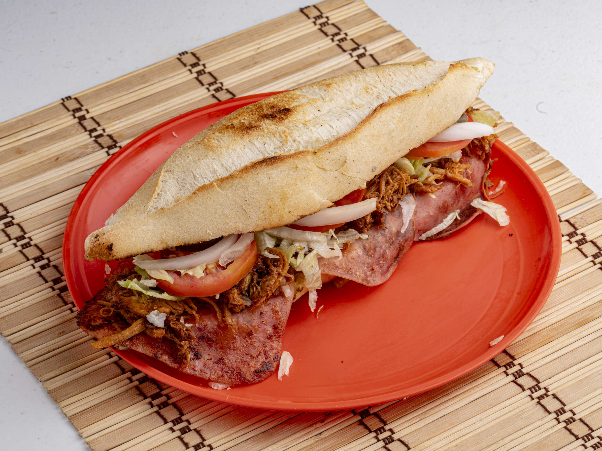 Pierna en adobo, jamón asado, panela asada, lechuga, jitomate, cebolla, chile jalapeño, chilito de la casa, catsup y mostaza