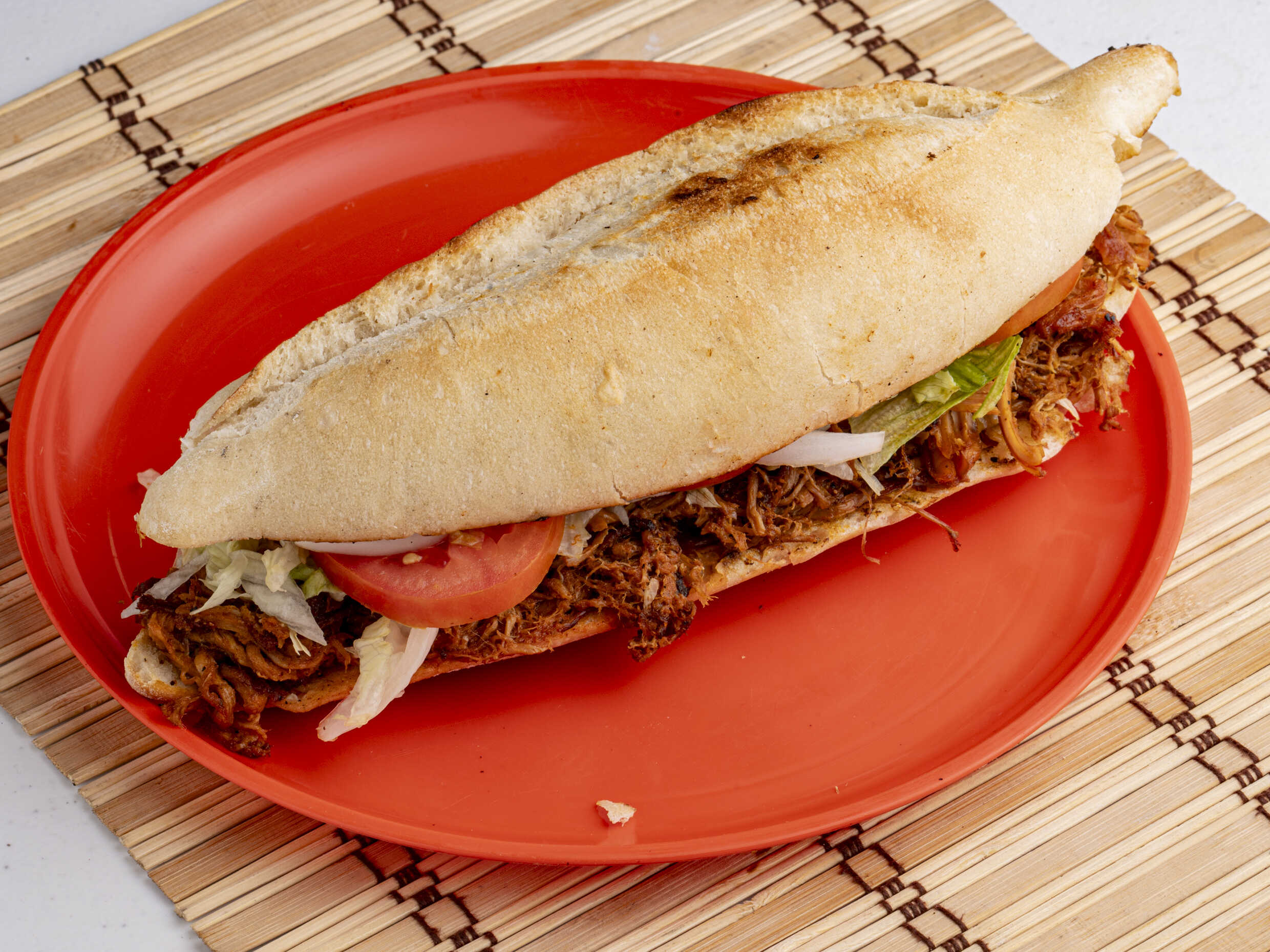 Pan integral, Pierna en adobo, lechuga, jitomate, cebolla, chile jalapeño, chilito de la casa, catsup y mostaza