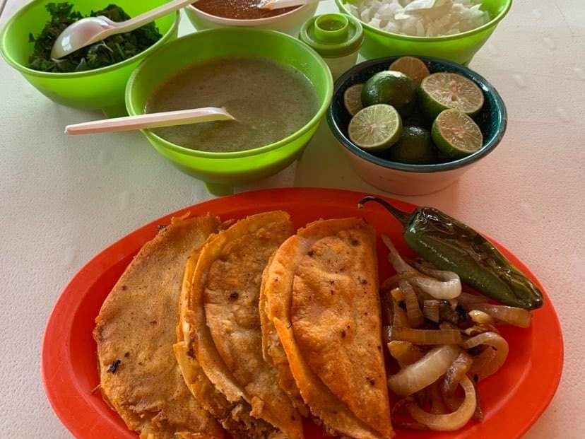 Cebolla guisada, cilantro, cebolla cruda, sal, limón y chilito de la casa