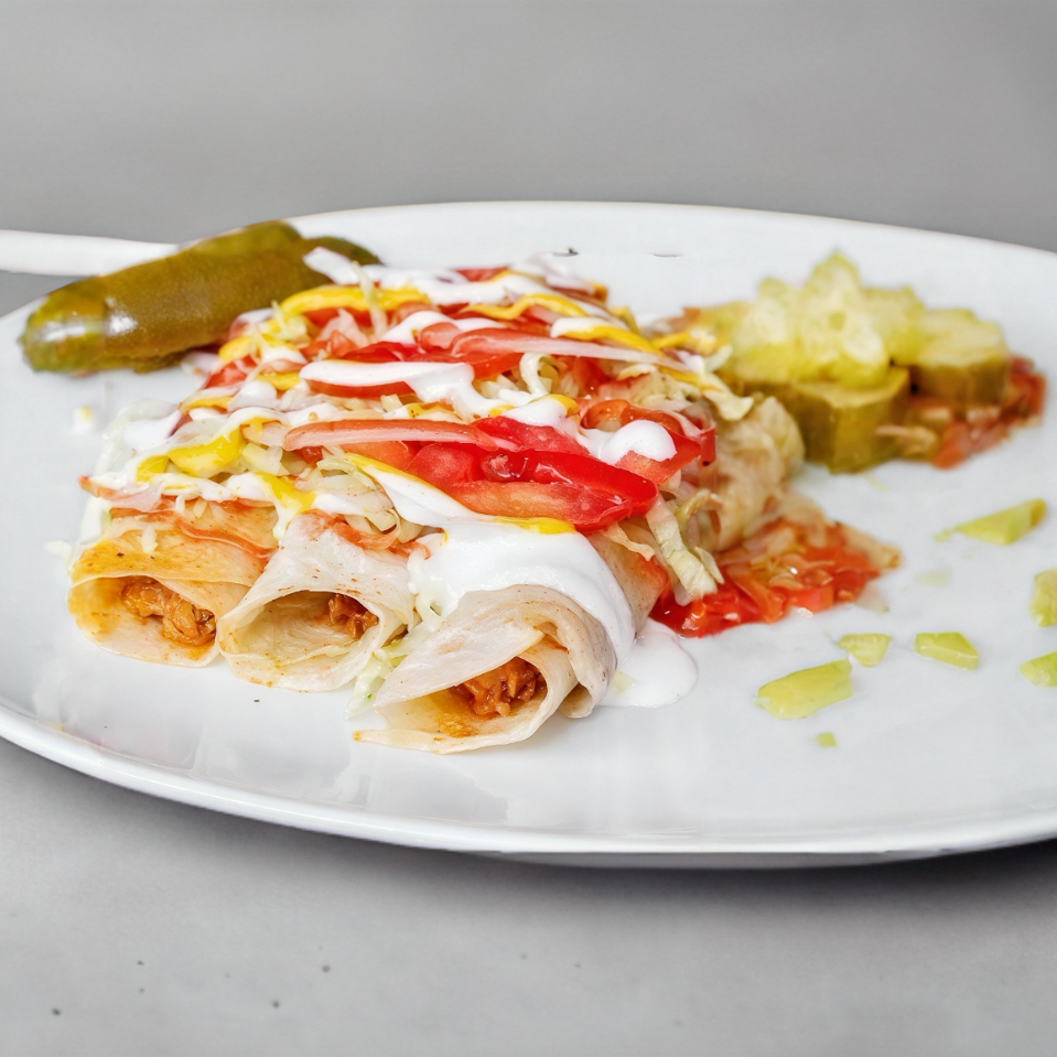 Burrita acompañada de jitomate, cebolla y lechuga.