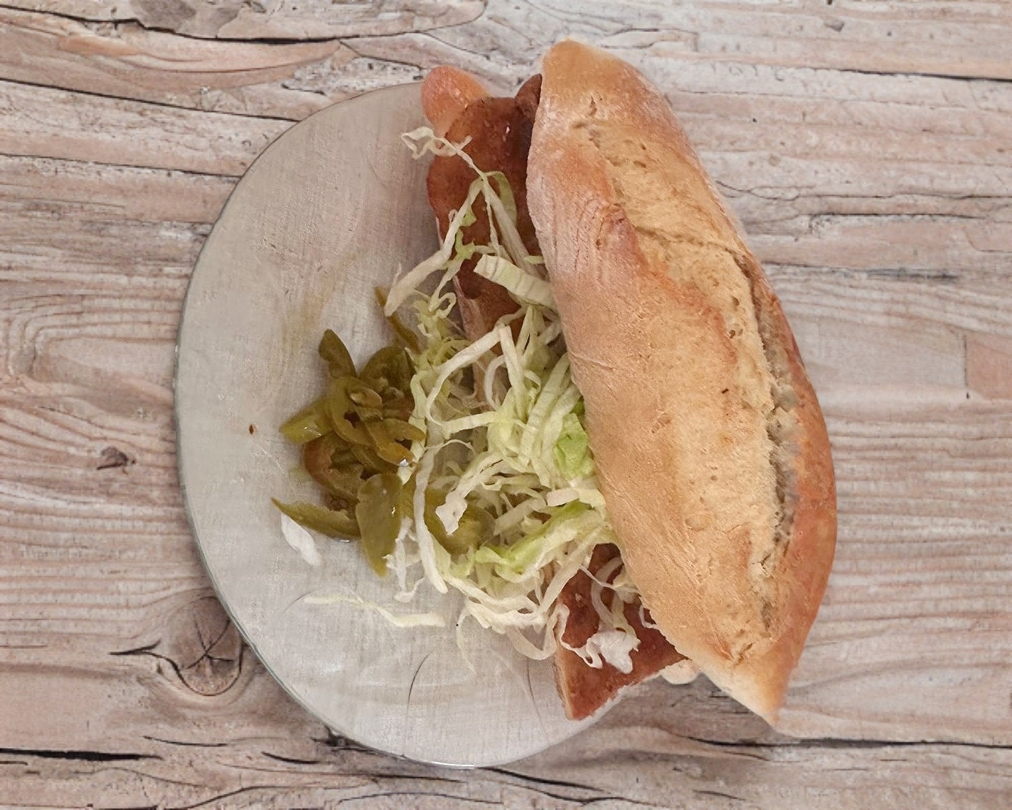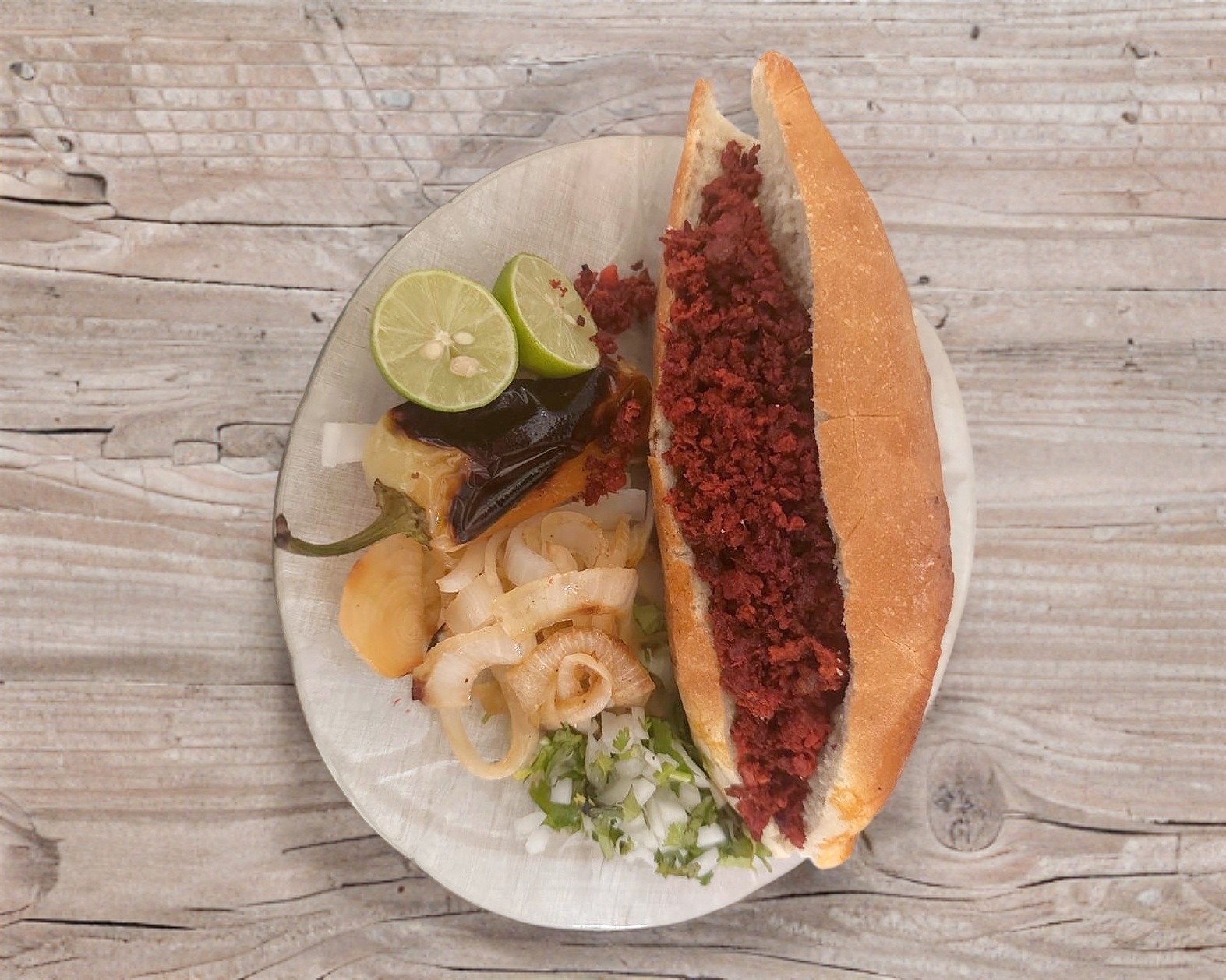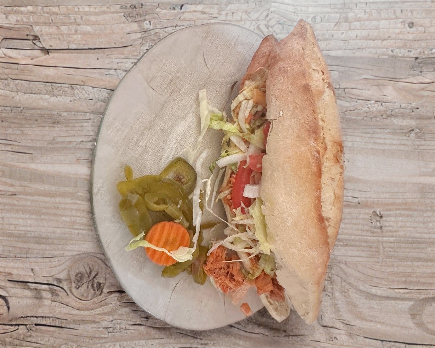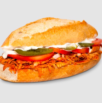 Bolillo, lechuga, tomate, cebolla, cátsup, mostaza y chile, pierna de cerdo deshebrada
