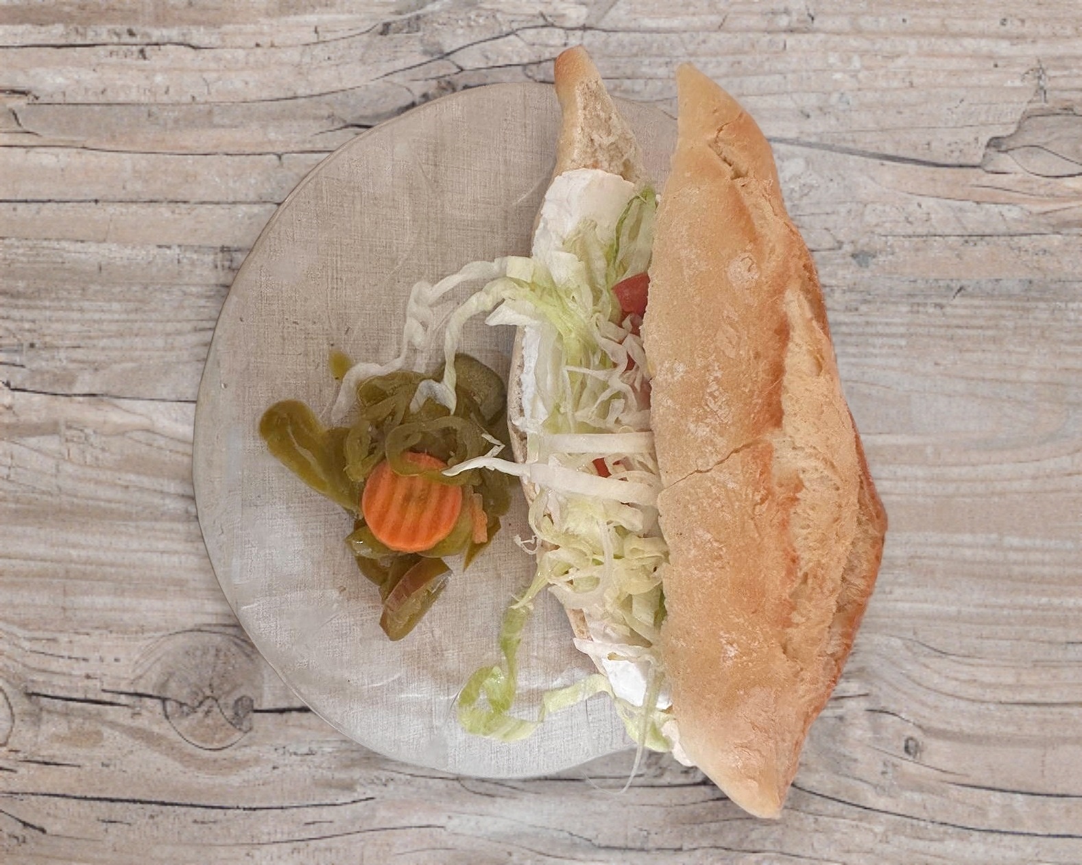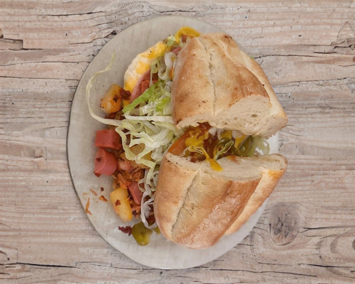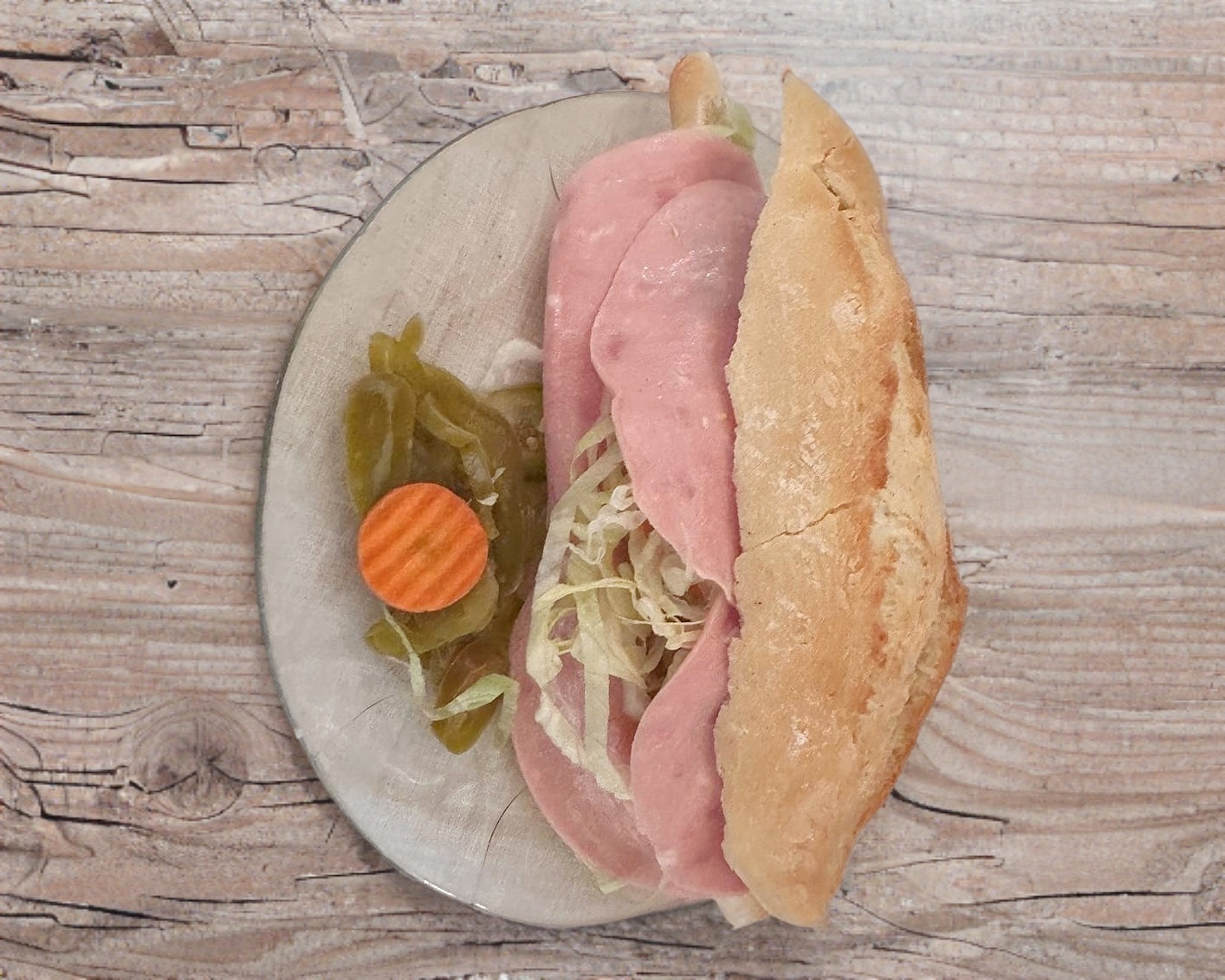 Bolillo, lechuga, tomate, cebolla, cátsup, mostaza y chile, pierna de cerdo deshebrada