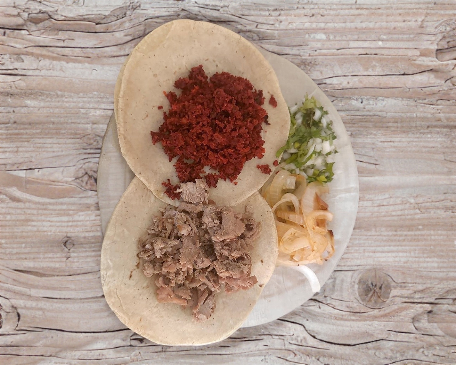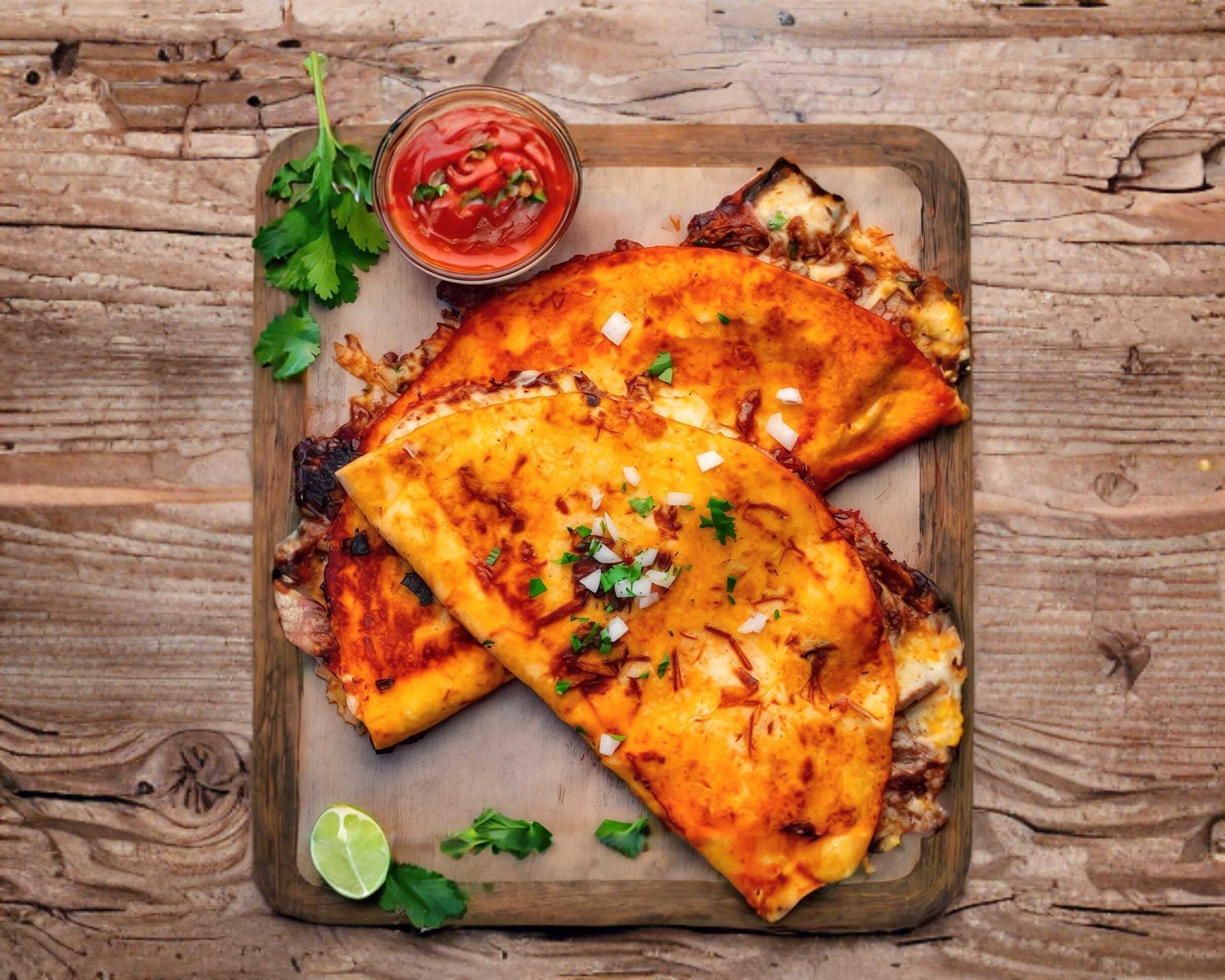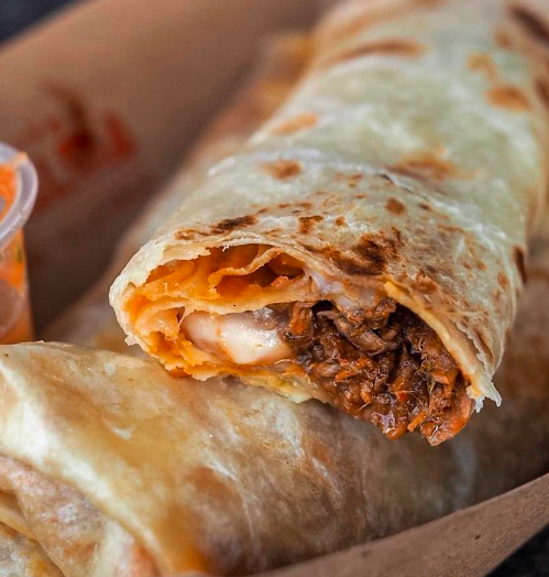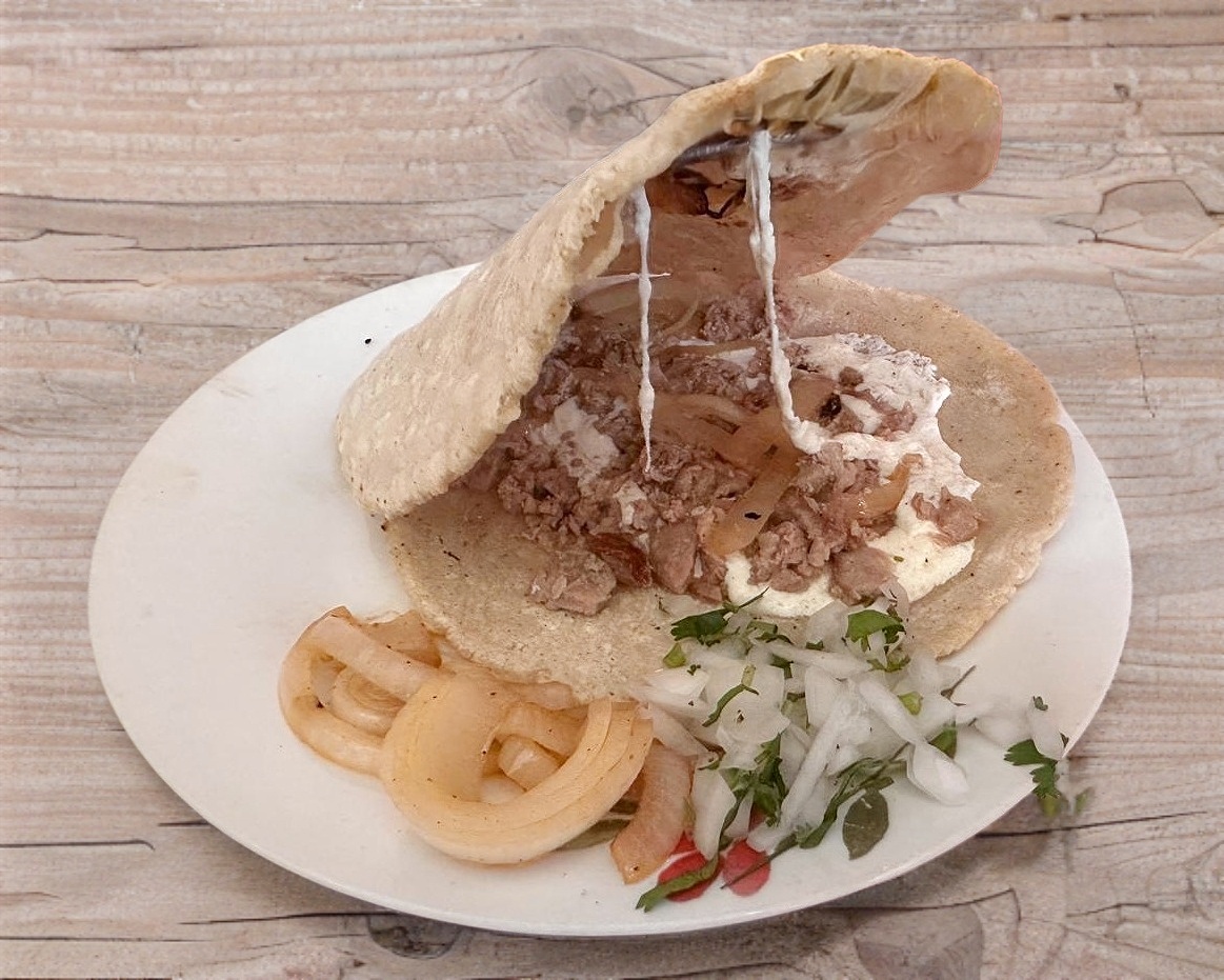 Tortilla de harina, carne de birria, queso de fundir, cebolla guisada