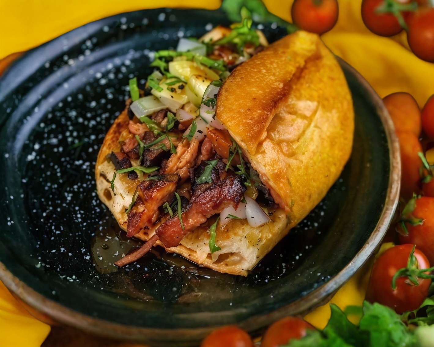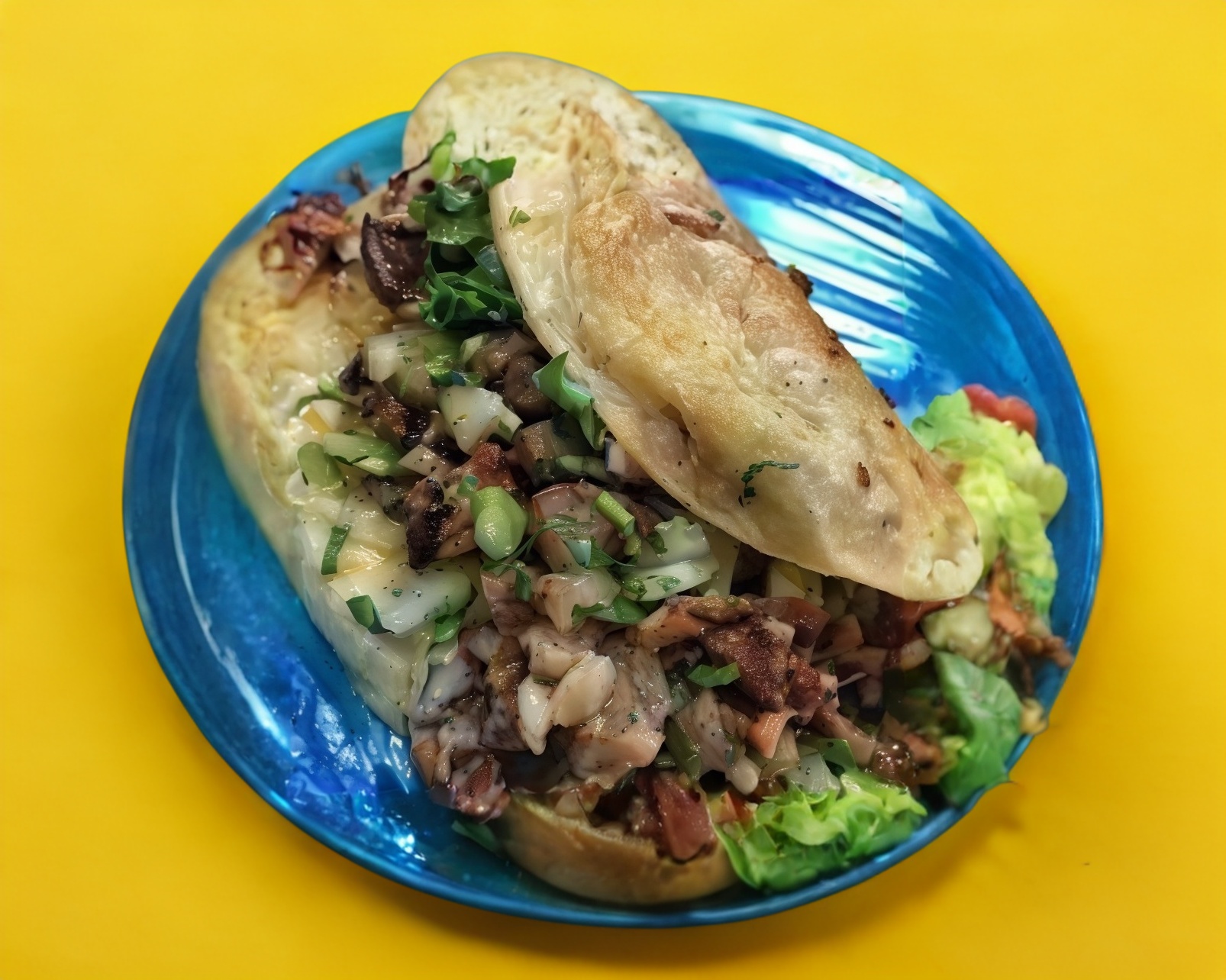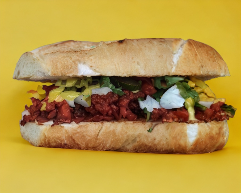 lonche de bistec con una capa de queso mozarella verdura, salsas aparte