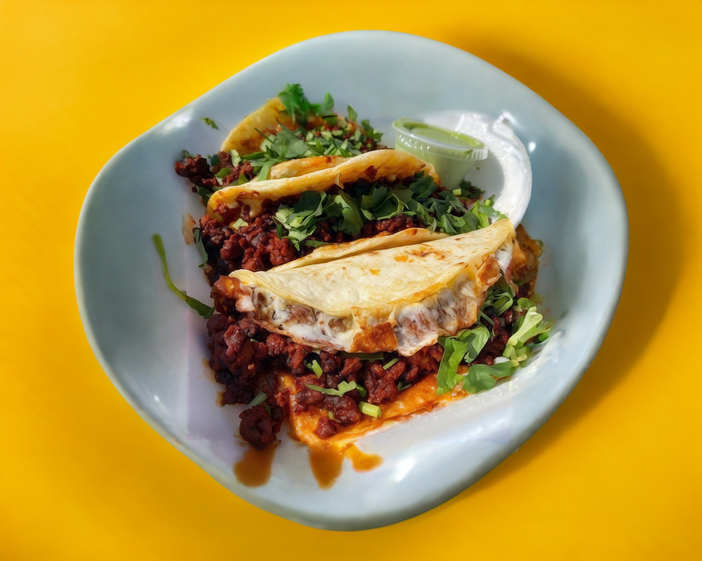 Tortilla de harina con carne al pastor, queso, cebolla, cilantro y salsas al gusto.
