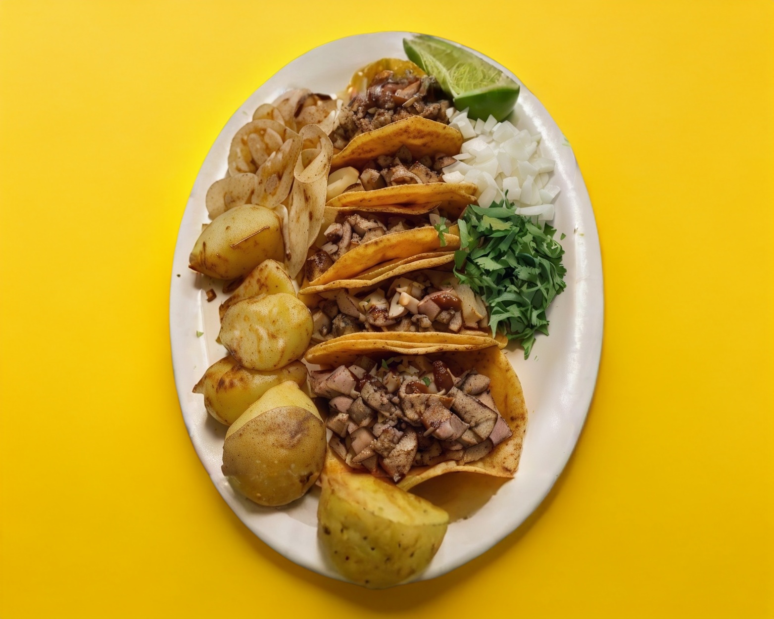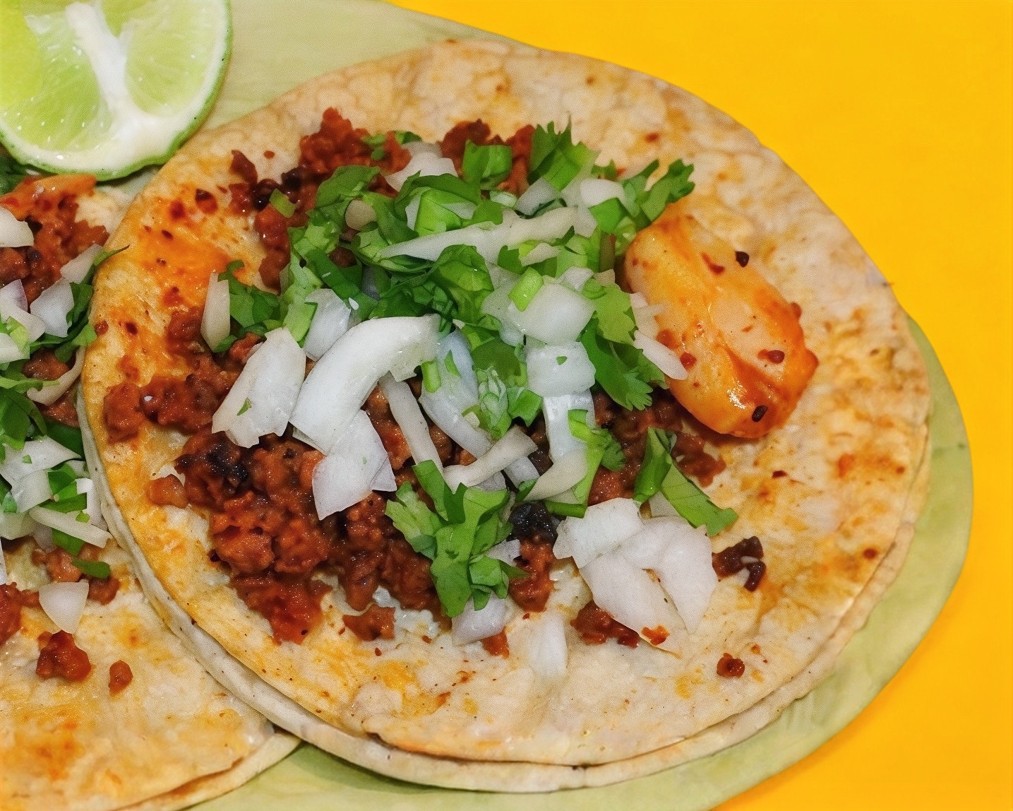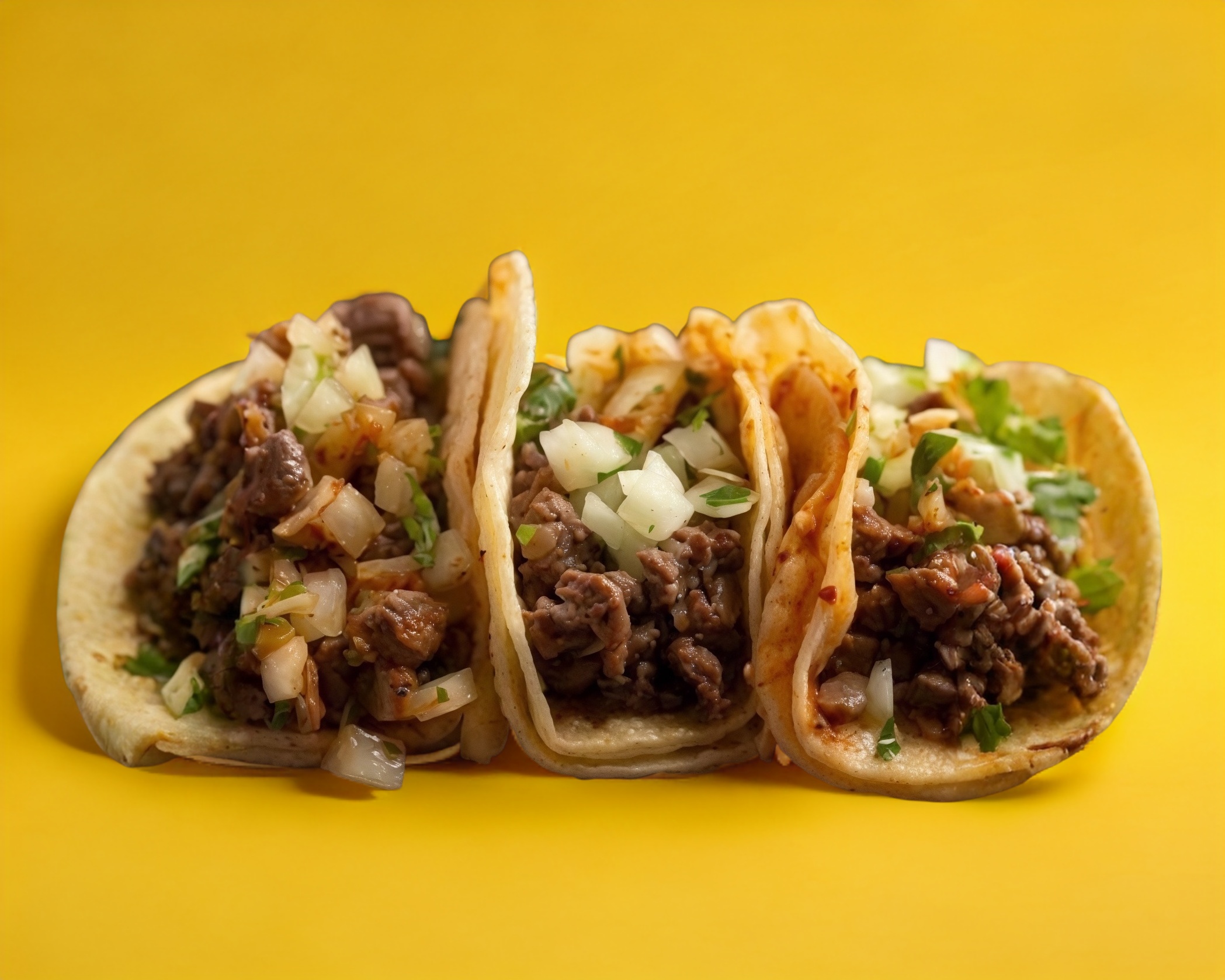 Tortilla de maíz, bistec, cebolla, cilantro y salsas al gusto.