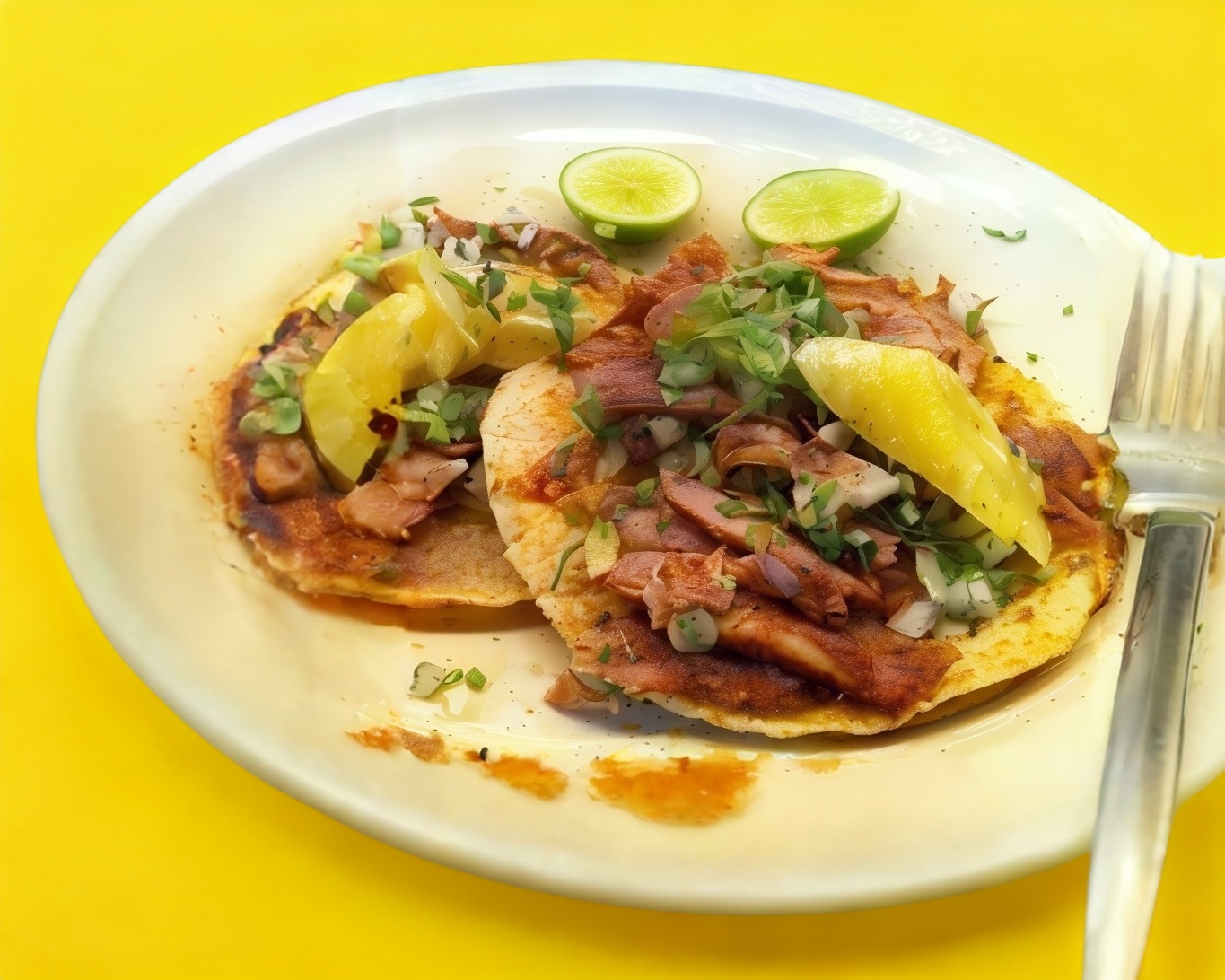 Tortilla de maíz, carne al pastor, cebolla, cilantro, salsas al gusto.