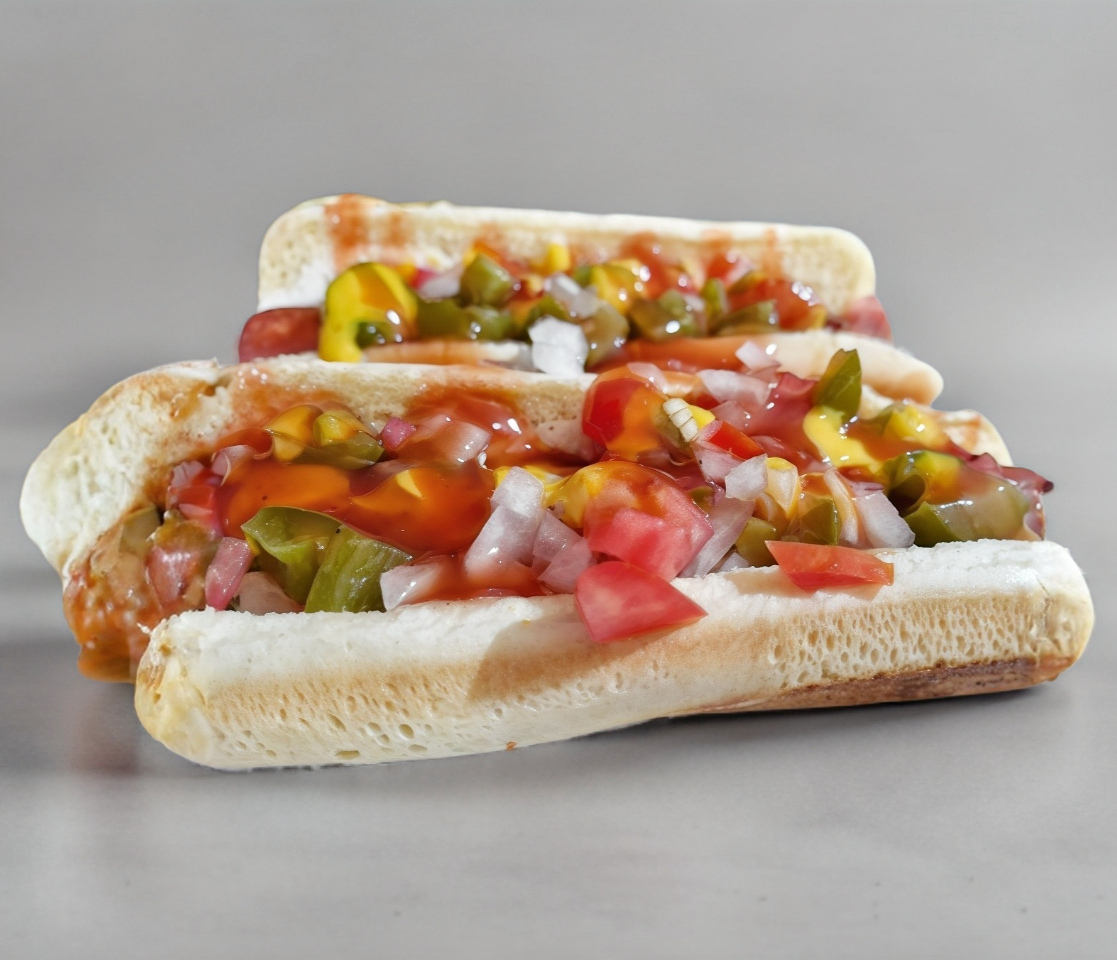 Preparado en bolillo y acompañado de jitomate cebolla lechuga catsup mostaza y chile jalapeño
