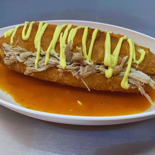 Birote, carne de cerdo deshebrada, aderezo y chiles jalapeños.