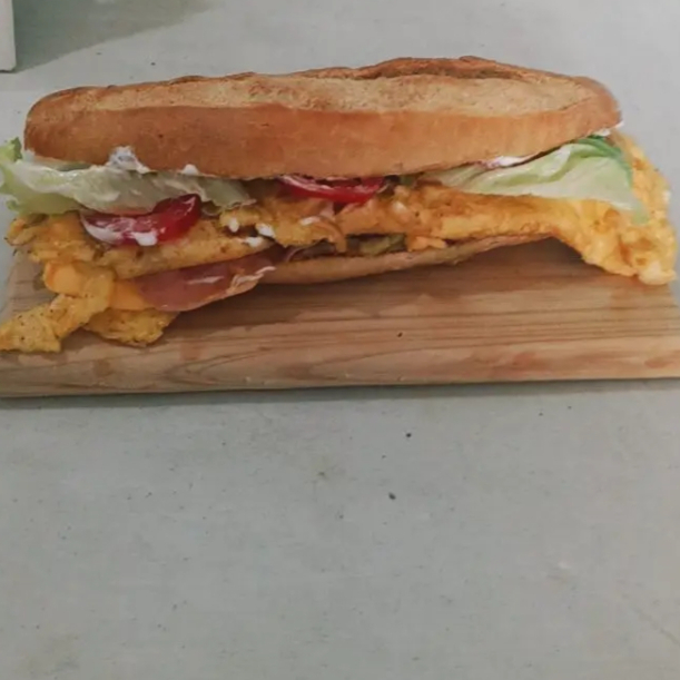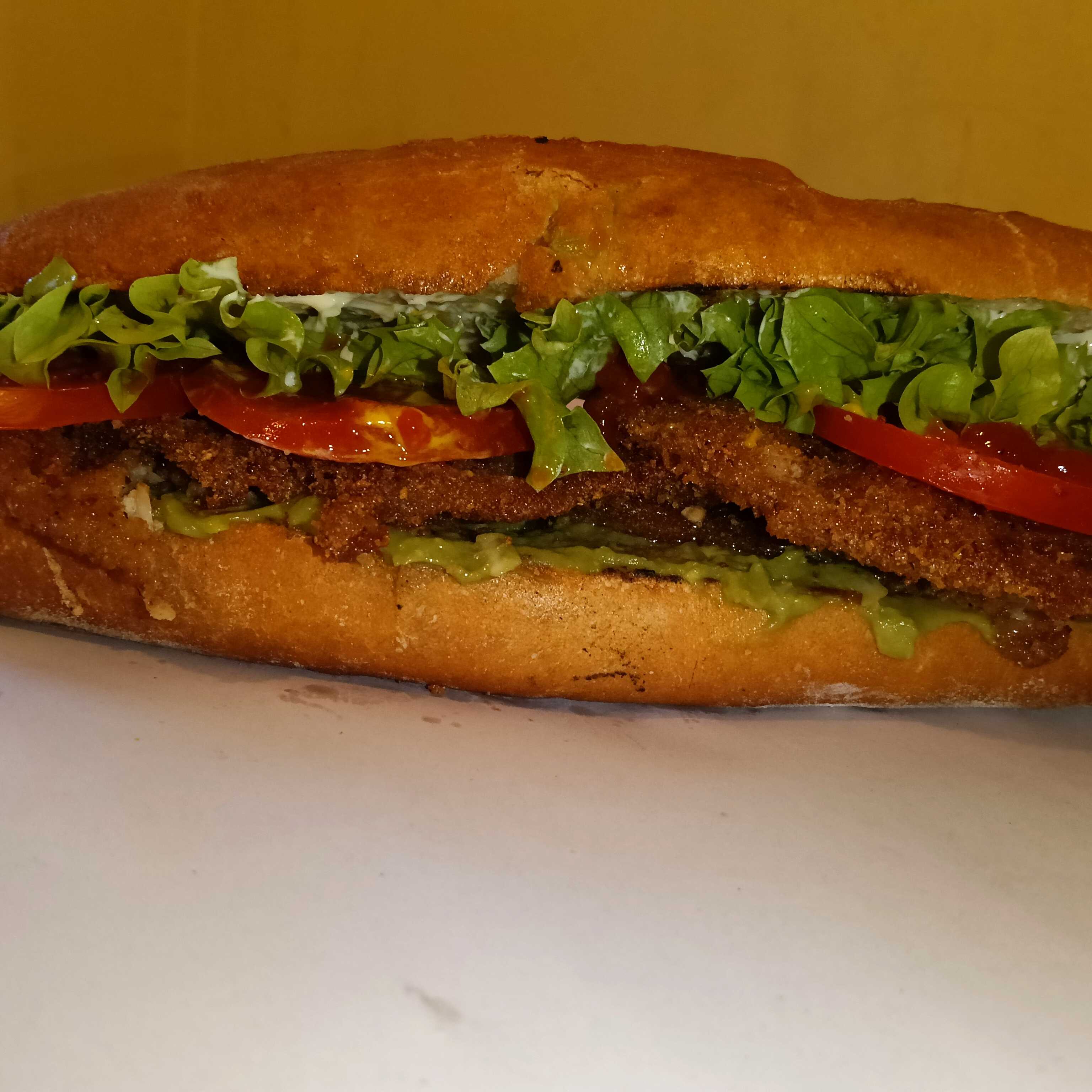 Crujiente milanesa de Res, su pan estilo fleima de 25-30 CM , jitomate, lechuga, Guacamole, mayonesa, crema, y su Especial salsa de tomate
