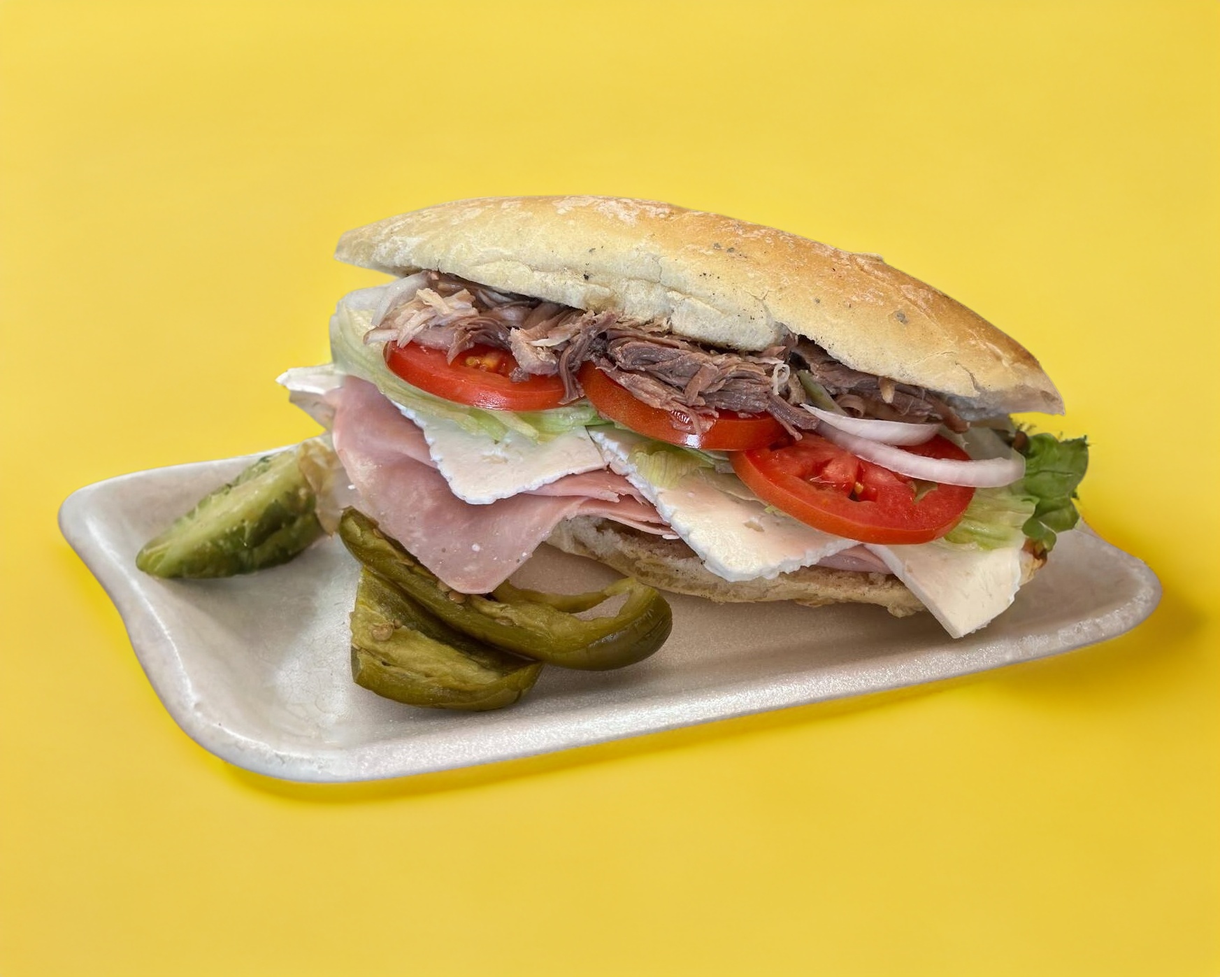 2 pzas De pan con jamón de pierna de cerdo acompañado de queso, crema, jitomate, cebolla, lechuga y jalapeño.