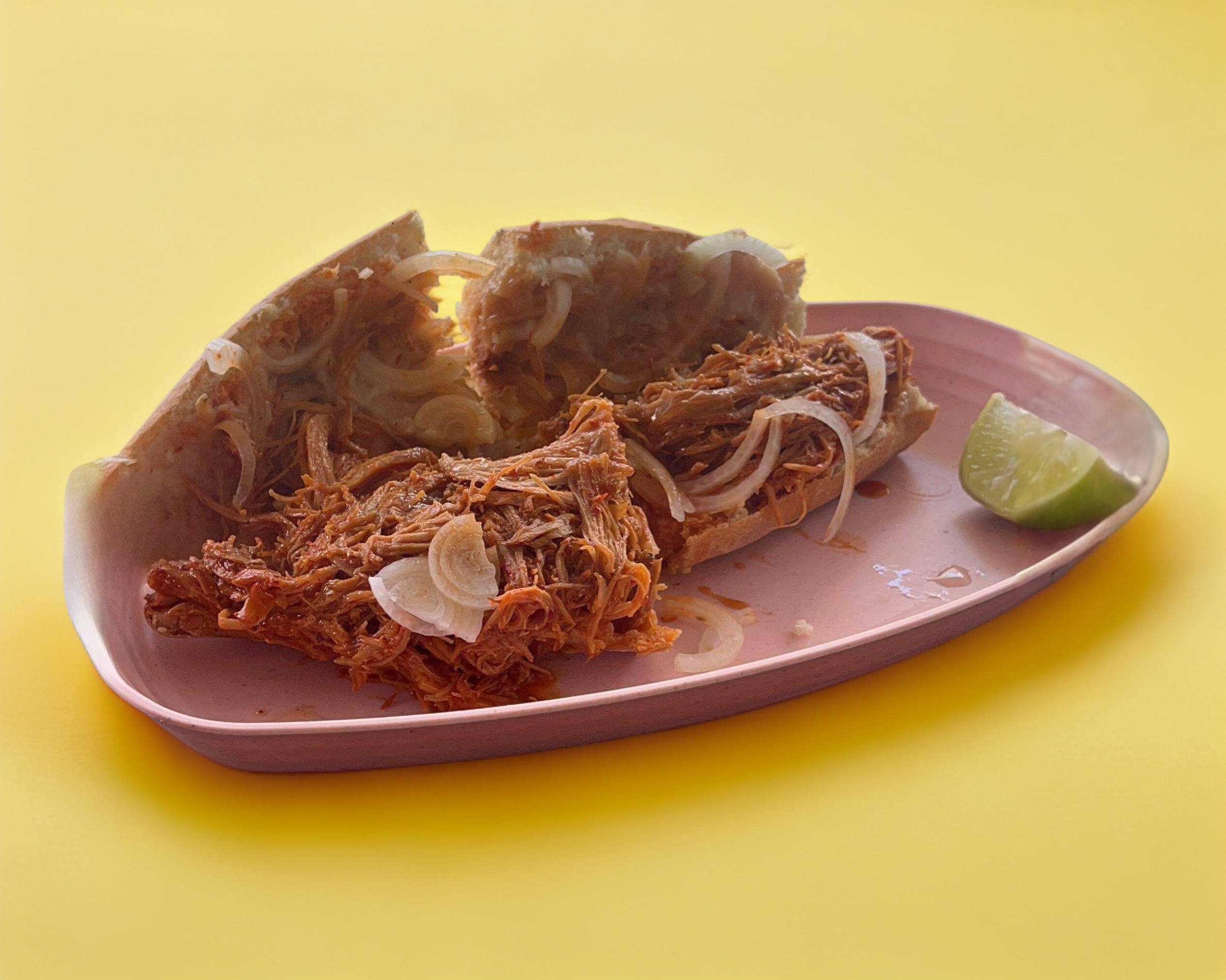 2 pzas De pan con pierna de cerdo acompañado de queso, crema, jitomate, cebolla, lechuga y jalapeño.