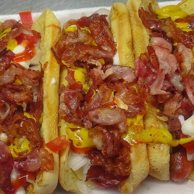 Salchicha envueta en tocino verduras y aderezos al gusto con tocino rebanado por encima