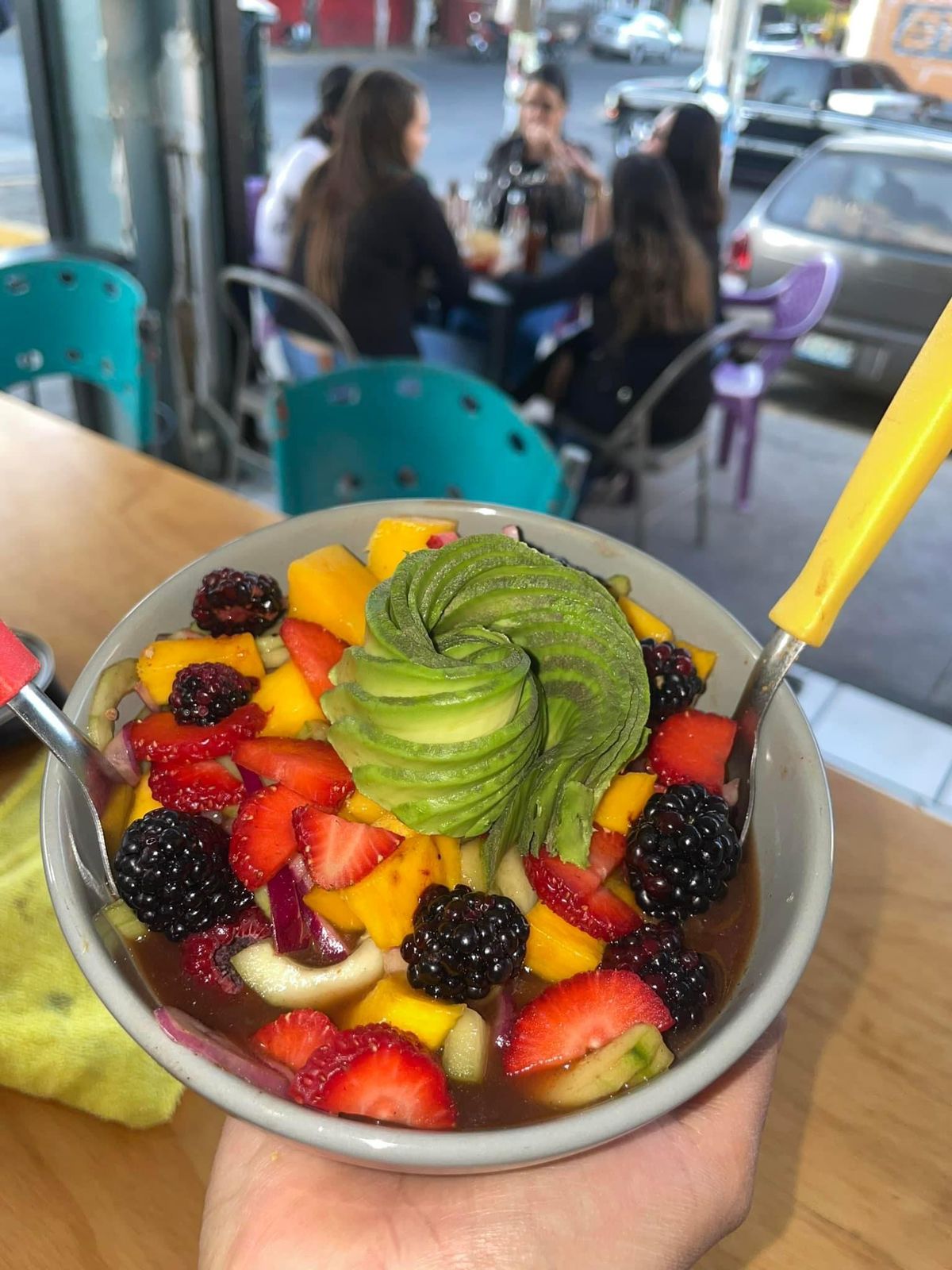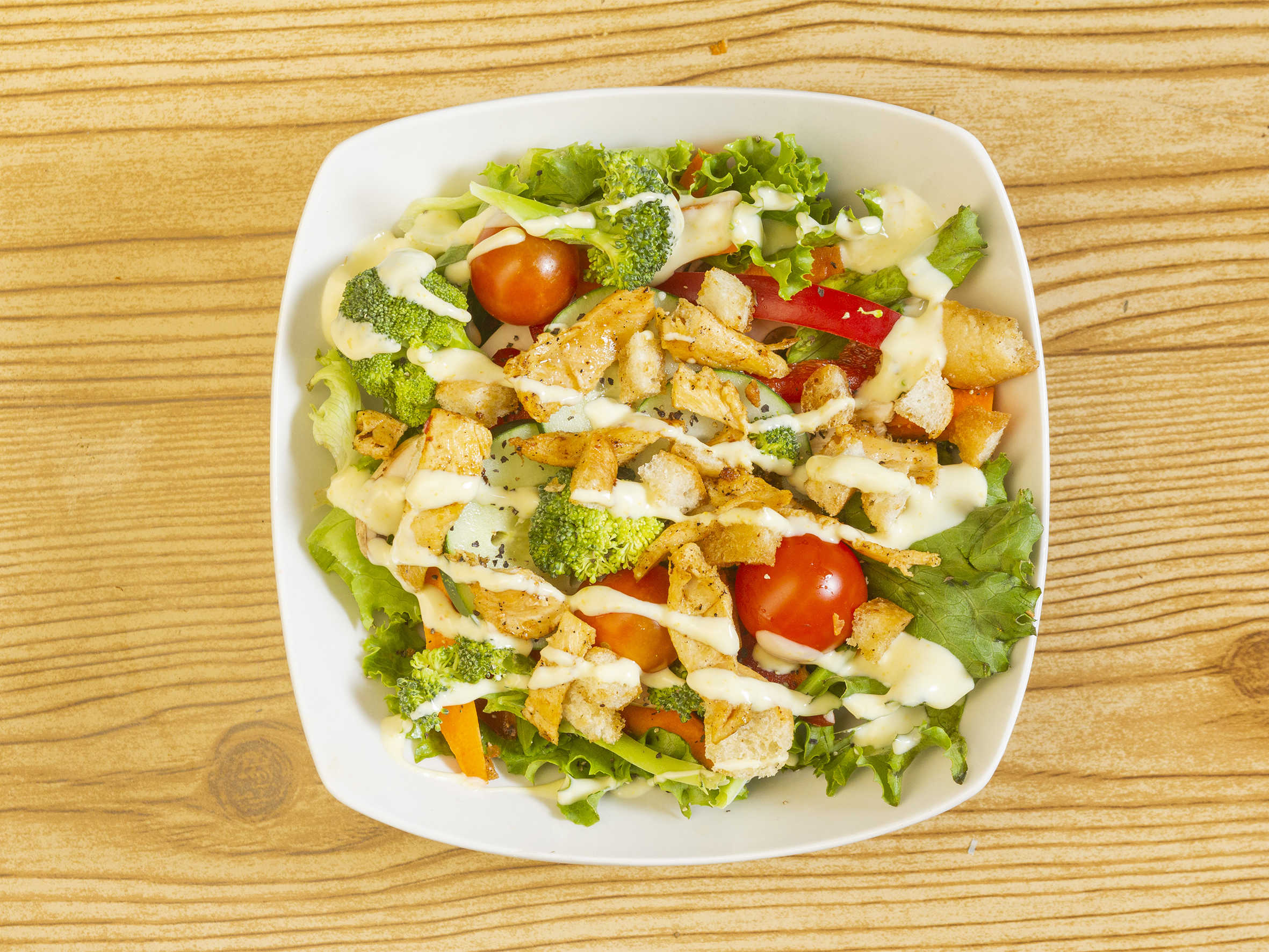 Ensalada Mosqu lechuga fresca,pepino,jitomate,fresas ,aderezo rancho.proteina a elegir(pollo,panela) gritones.