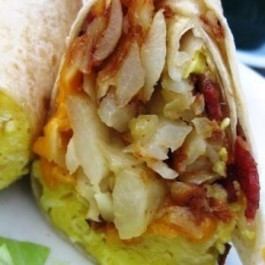 Tortilla de harina rellena de queso fundido, vegetales frescos, catsup y mostaza.