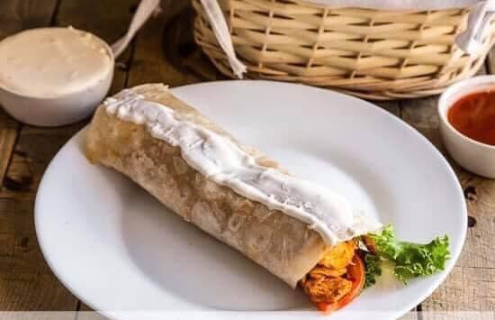 Tortilla de harina rellena de queso fundido y camarones, vegetales frescos, catsup, mostaza y aderezo.