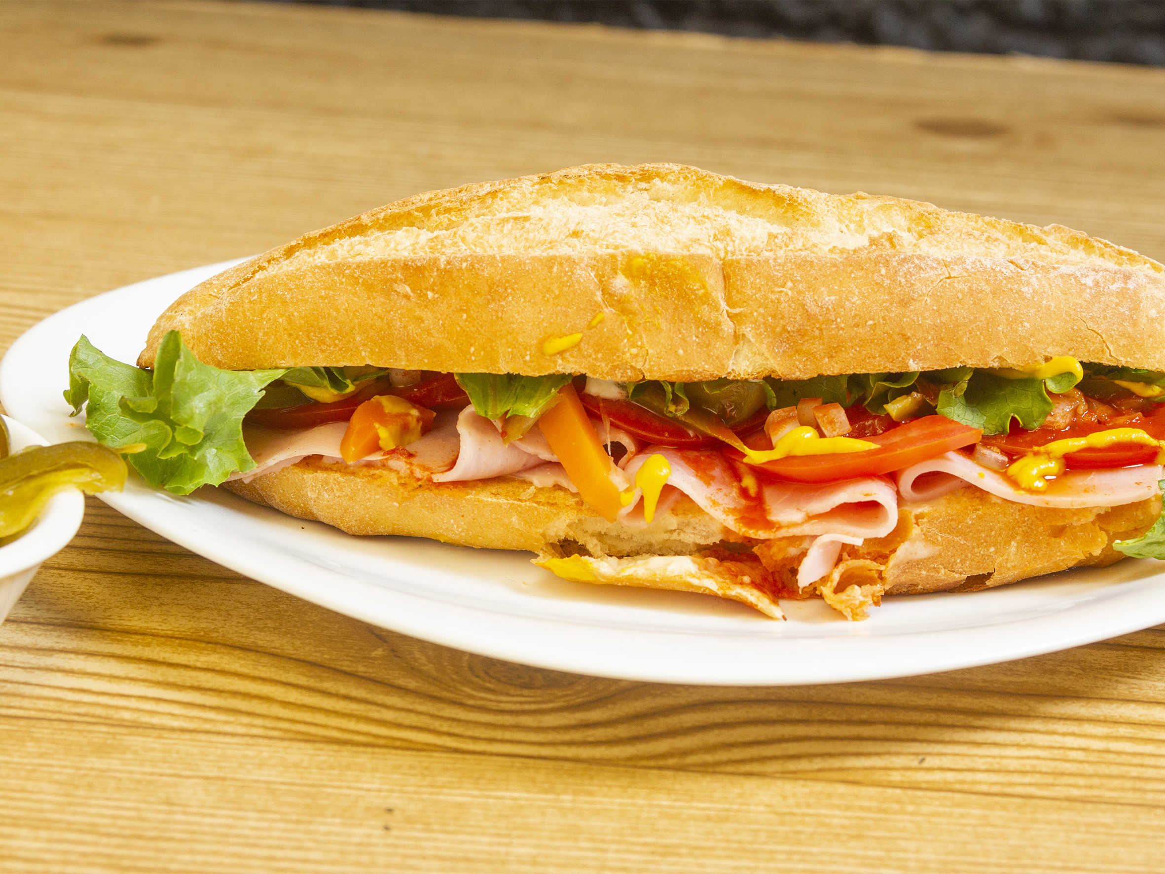 Pan de caja con jamón y vegetales frescos.
