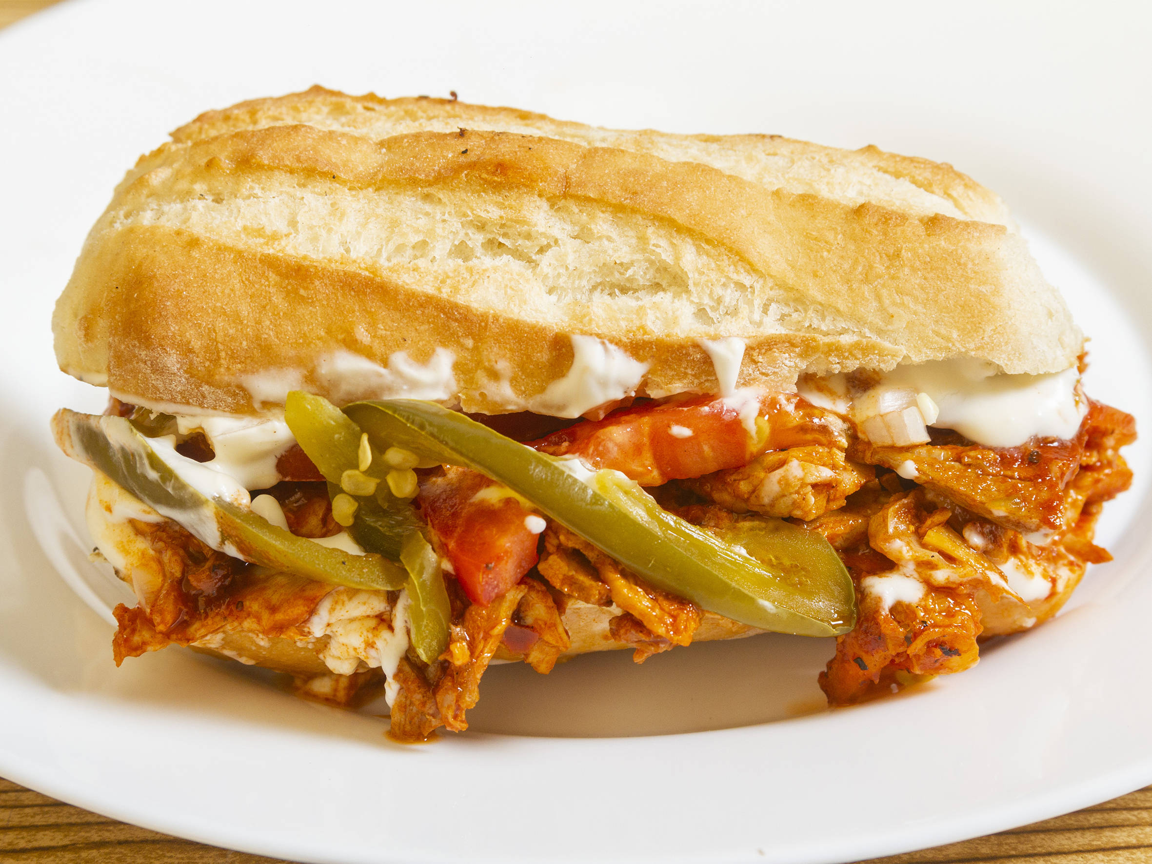 Exquisito lonche de pierna de cerdo rebanado y adobado con salsa especial de la casa Veliz, vegetales frescos jitomate, cebolla, chiles jalapeños en vinagre.