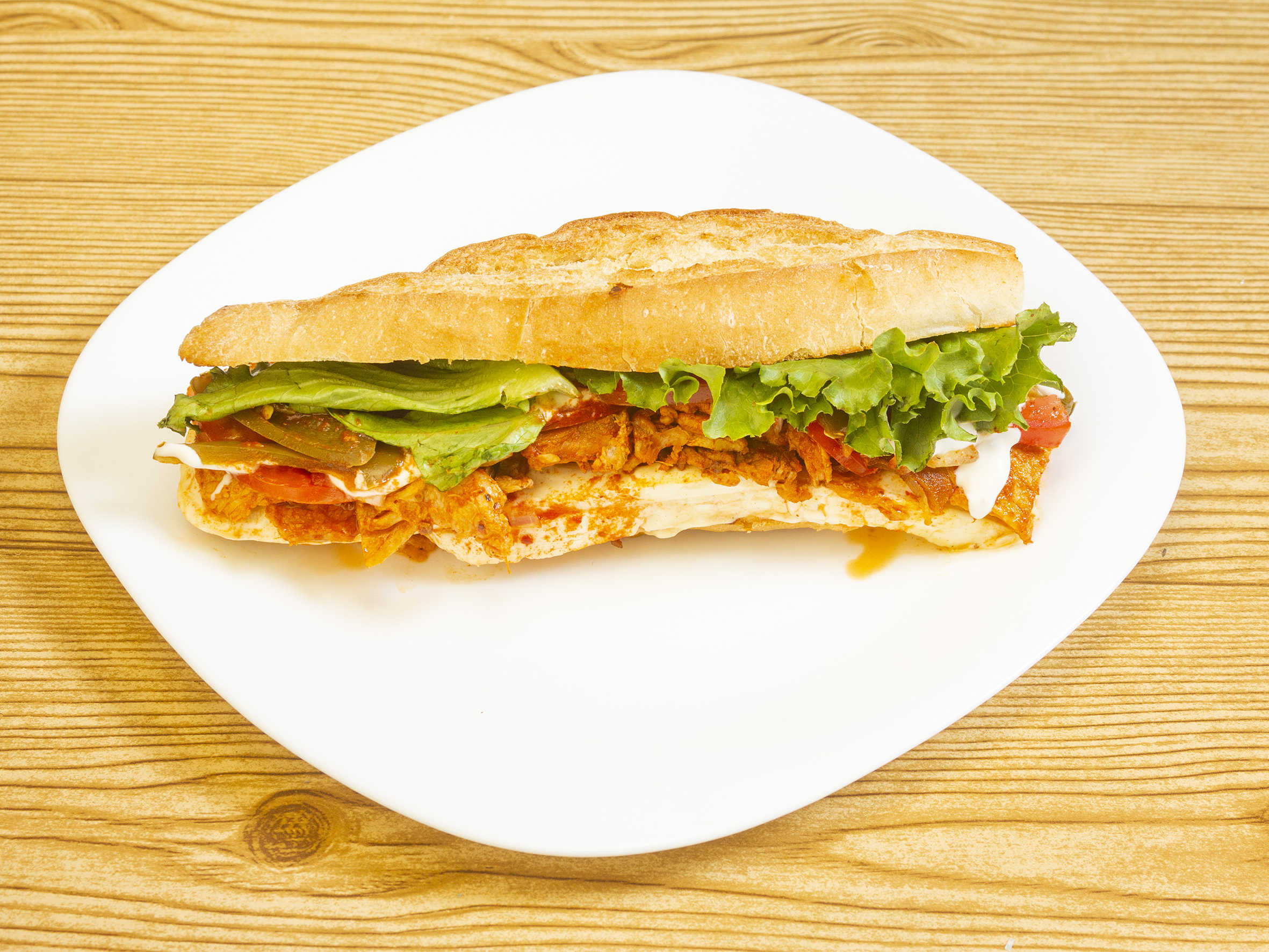 Jamón de pierna, vegetales frescos lechuga, jitomate, cebolla, chile jalapeño y un toque de salsa veliz.