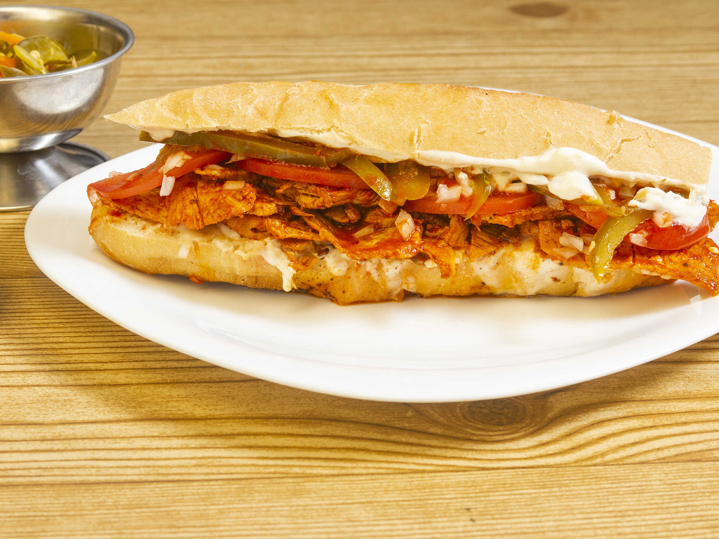 lonche de pierna de cerdo rebanado y adobado con salsa especial de la casa Veliz y panela fundida, vegetales frescos jitomate, cebolla, chile jalapeño en vinagre.