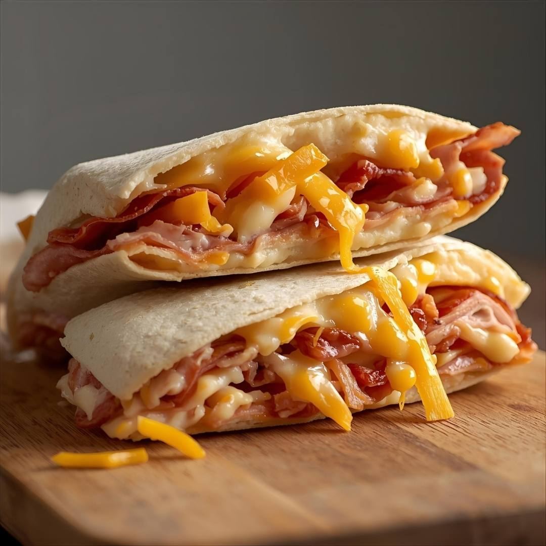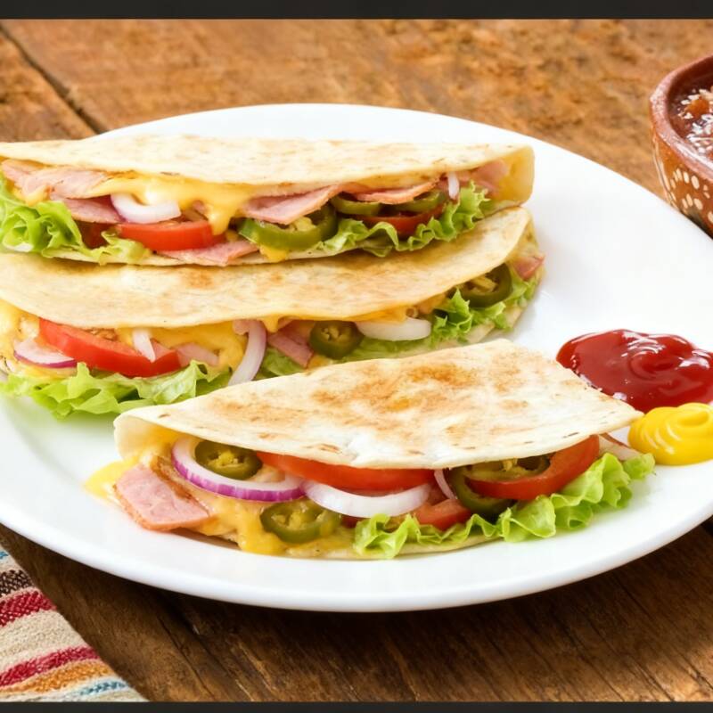 dos tortillas de harina empalmadas rellenas de jamón con queso ,lechuga, jitomate, cebolla, cátsup, mostaza picante aparte