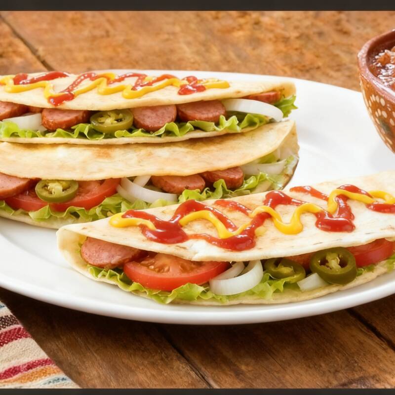 En tortilla de harina con queso fundido salchicha de pierna lechuga, jitomate , jalapeños,cebolla, catsup mostaza