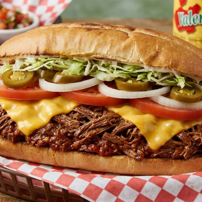 carne deshebrada adobada, queso ,lechuga , jitomate, cebolla ,jalapeños , cátsup , mostaza