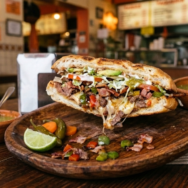 en pan telera ,jugosa arrachera marinada con cebolla cilantro picante aparte