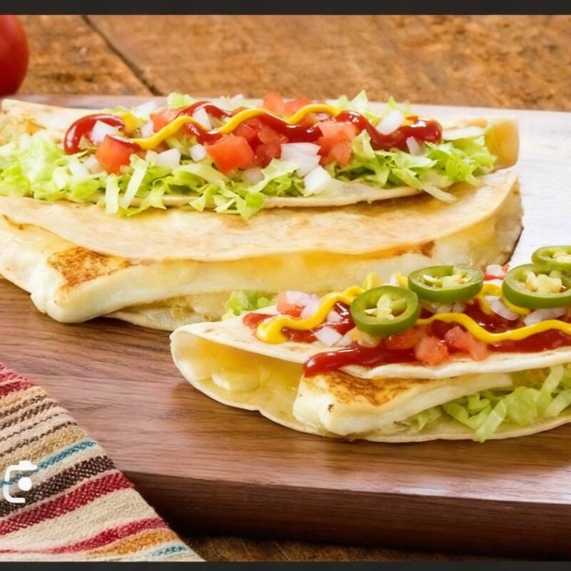 dos tortillas de harina empalmadas rellenas de queso con pierna , salchicha, jamón, lechuga, jitomate, cebolla, cátsup, mostaza, picante aparte