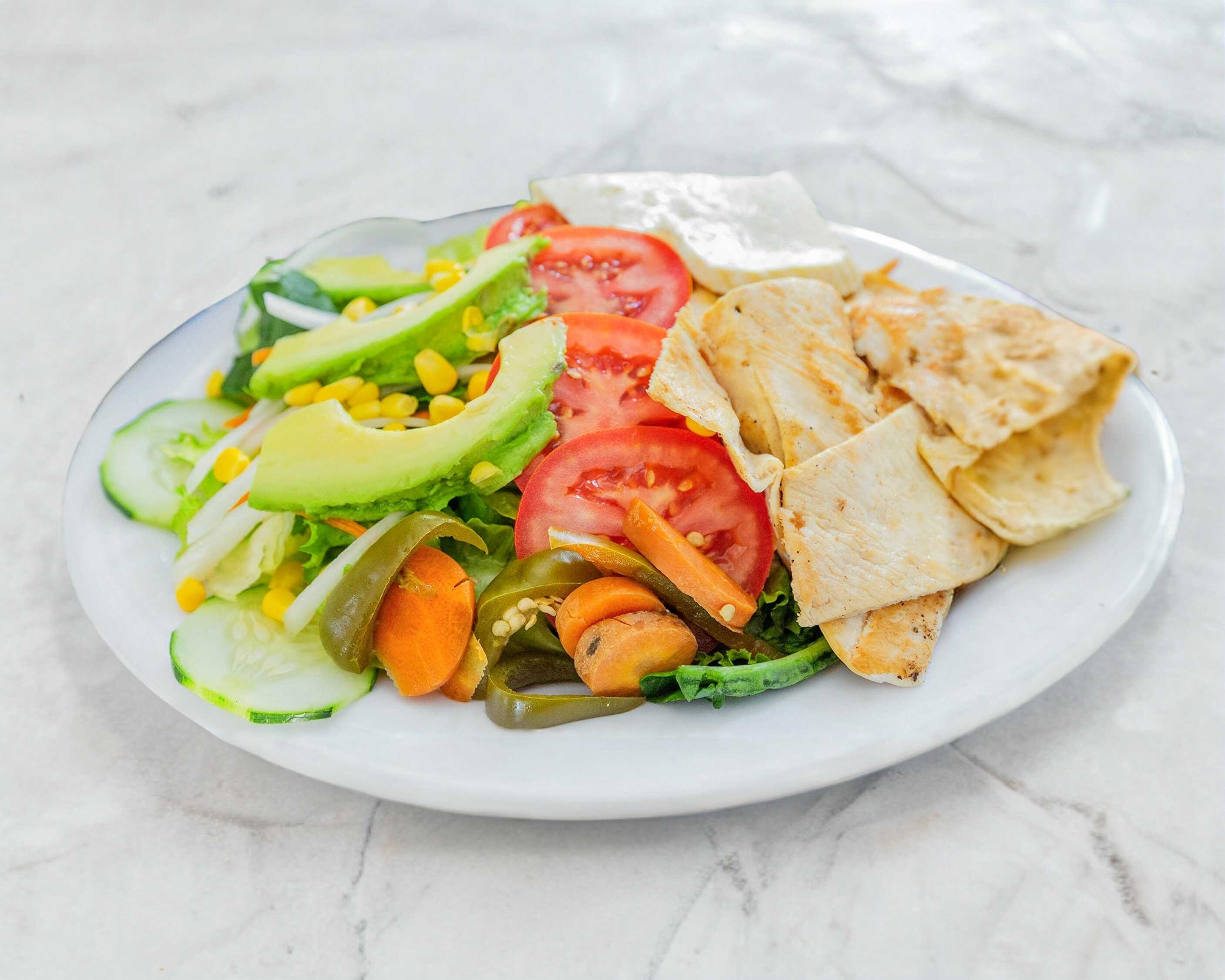 Deliciosa ensalada de mezcla de vegetales frescos entre espinaca lechuga zanahoria pepino germinado elote aguacate jitomate acompañada de pechuga de pollo asada a la plancha todos los ingredientes preparados al momento con la receta de la casa.
