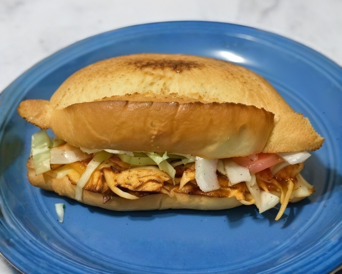 lonche preparado con pechuga de pollo asada con crema, mayonesa, verduras, y chiles jalapeños.