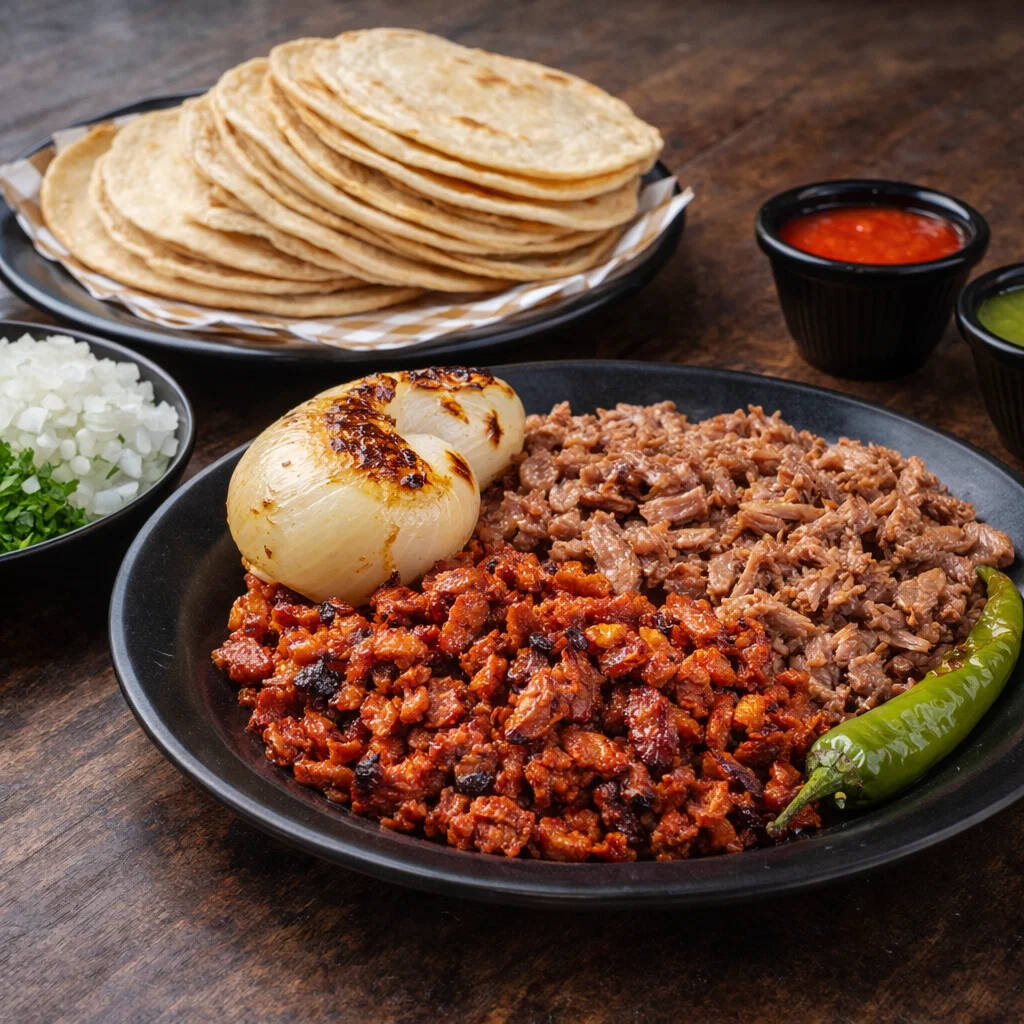 Incluye 250gr. de carne de carnaza pesada ya cocinada, tortillas de maiz, salsas roja picosita y verde sin picante, cebolla y cilantro.