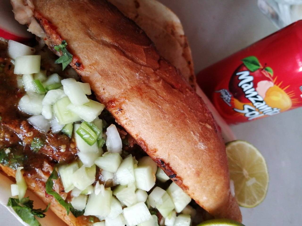 1 Lonche de birria roja, 2 tacos de birria más refresco de 400ml. Mirinda, Manzanita, 7up, Pepsi