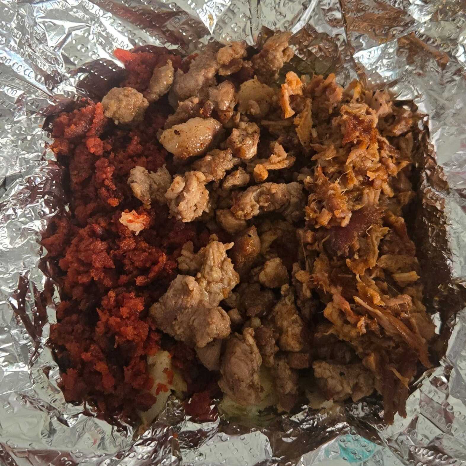 Mantequilla bistec birria y chorizo queso fundido y aderezo.