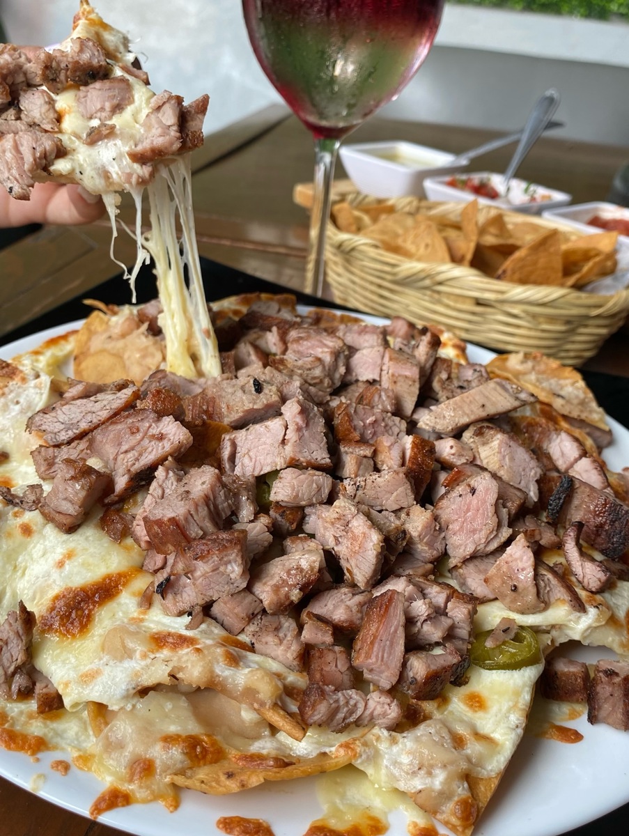 TROZOS DE TORTILLA DE MAIZ FRITOS CON FRIJOLES, CUBIERTOS CON QUESO BLANCO GATINADO, CORONADO CON CHILES JALAPEÑOS, ACOMPAÑALO CON CARNE SI LO DESEAS.
