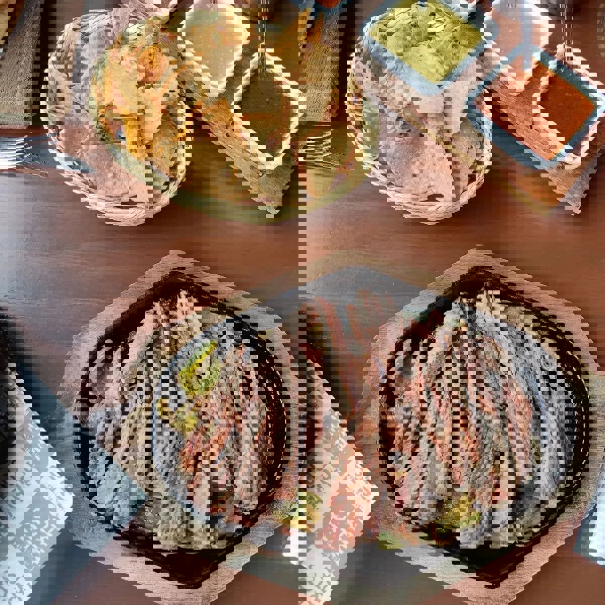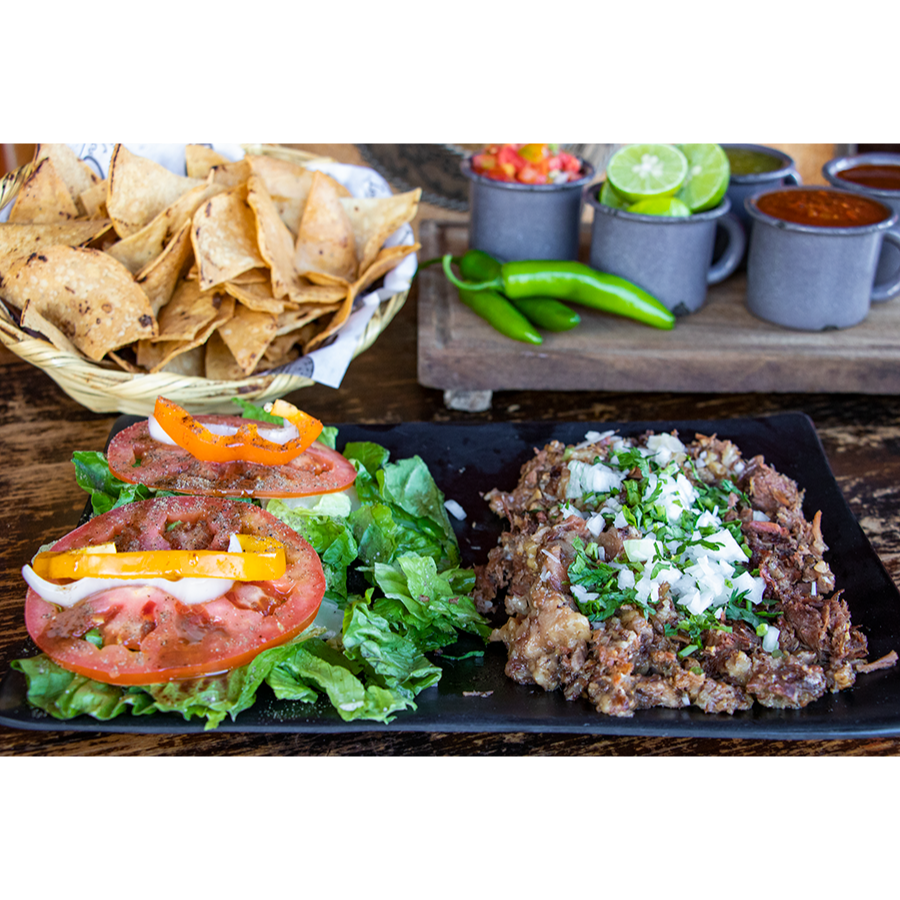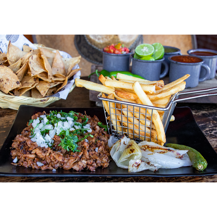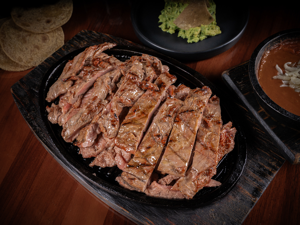 .250GR ARRACHERA MARINADA COCINADA AL CARBON PICADA EN TROZO CON BUENA TEXTURA, ORDEN CON MUCHO SABOR ACOMPAÑADA DE CEBOLLITA GUISADA, CHILE TOREADO, TORTILLA DE MAIZ Y GUARNICION A ELEGIR.