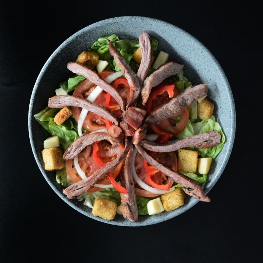 .150GR DE CARNE DE ARRACHERA CON UNA FRESCA CAMA DE LECHUGA, JITOMATE, CEBOLLA, PIMIENTO MORRON, CROTONES, QUESO OAXACA Y UN TOQUE DE TOCINO.