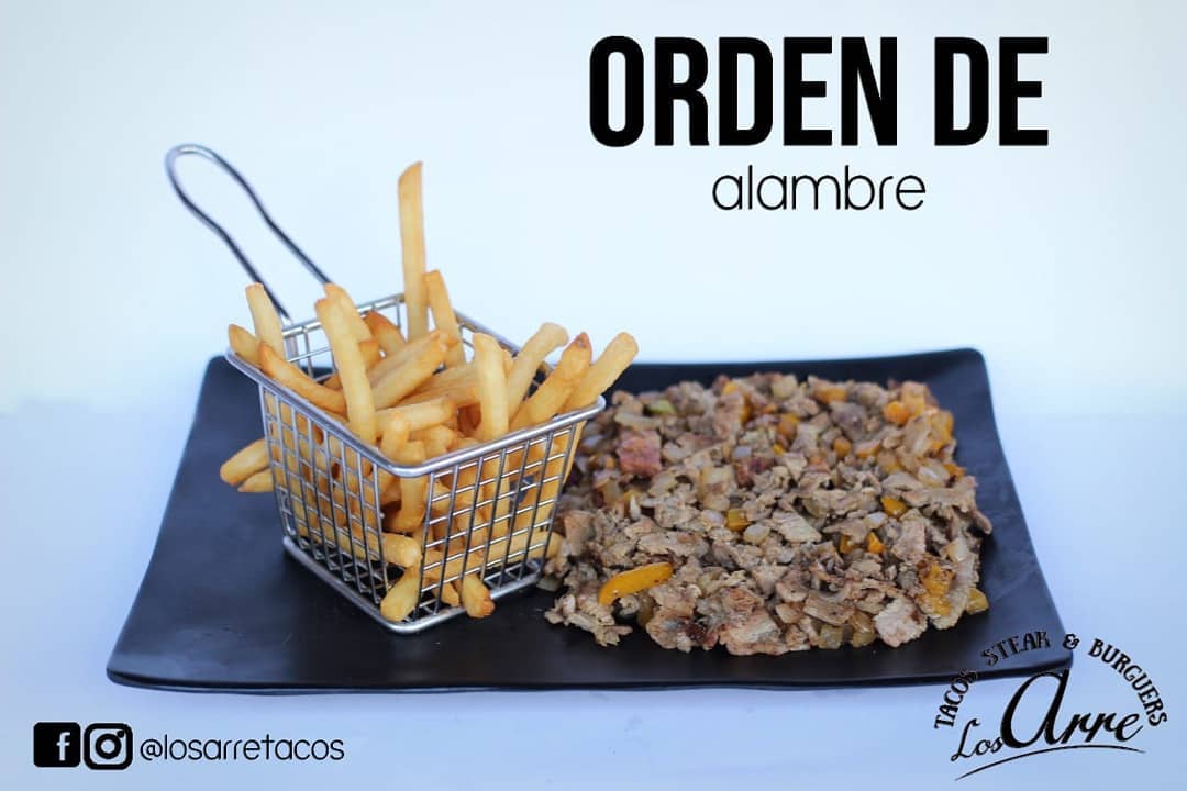 CARNE DE BISTEC MEZCLADA CON CEBOLLA, PIMIENTO MORRON, UN TOQUE DE TOCINO ACOMPAÑADO DE TORTILLAS DE MAIZ.