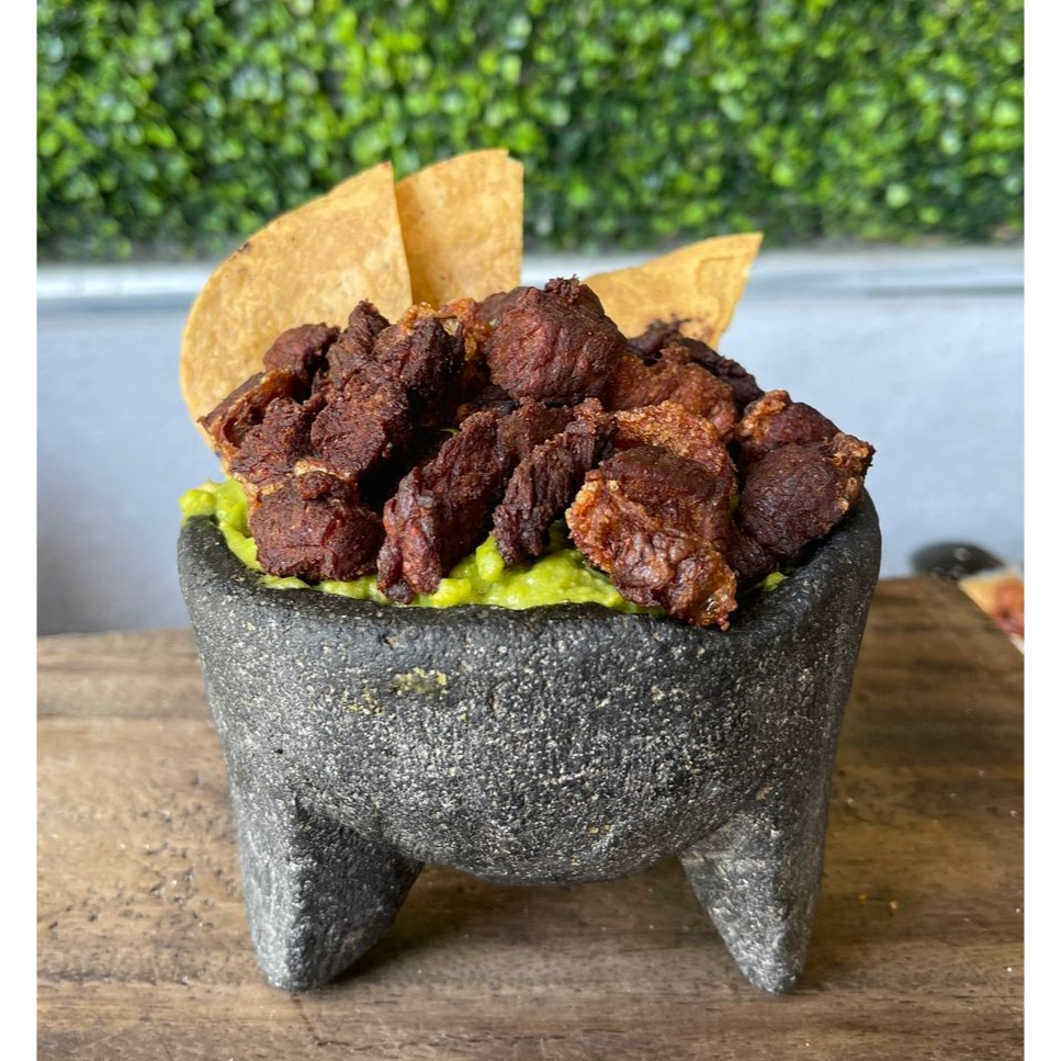 TRADICIONAL GUACAMOLE CREMOSO CON UN TOQUE DE JITOMATE, CEBOLLA, CILANTRO ACOMPAÑADO DE TOTOPOS