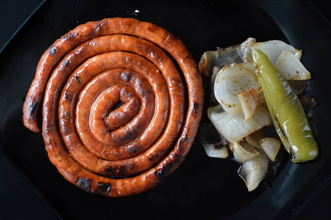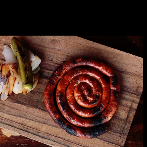 CHISTORRA COCINADA AL CARBON 125.GR ACOMPAÑADA CON CEBOLLITA GUISADA Y UN CHILE TOREADO.