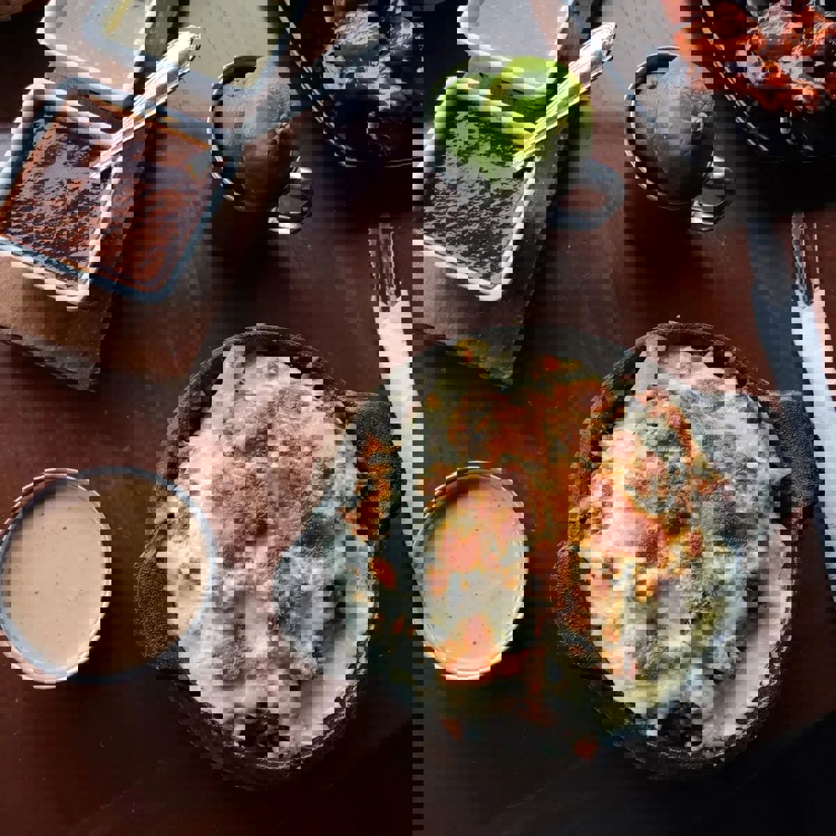 CARNE ADOBADA DE CERDO LSITA PARA ARMAR TACOS COMO SE DEBE, ACOMPAÑADA CON CEBOLLA GUISADA, TORTILLA, CHILE TOREADO Y VERDURA (CEBOLLA Y CILANTRO)